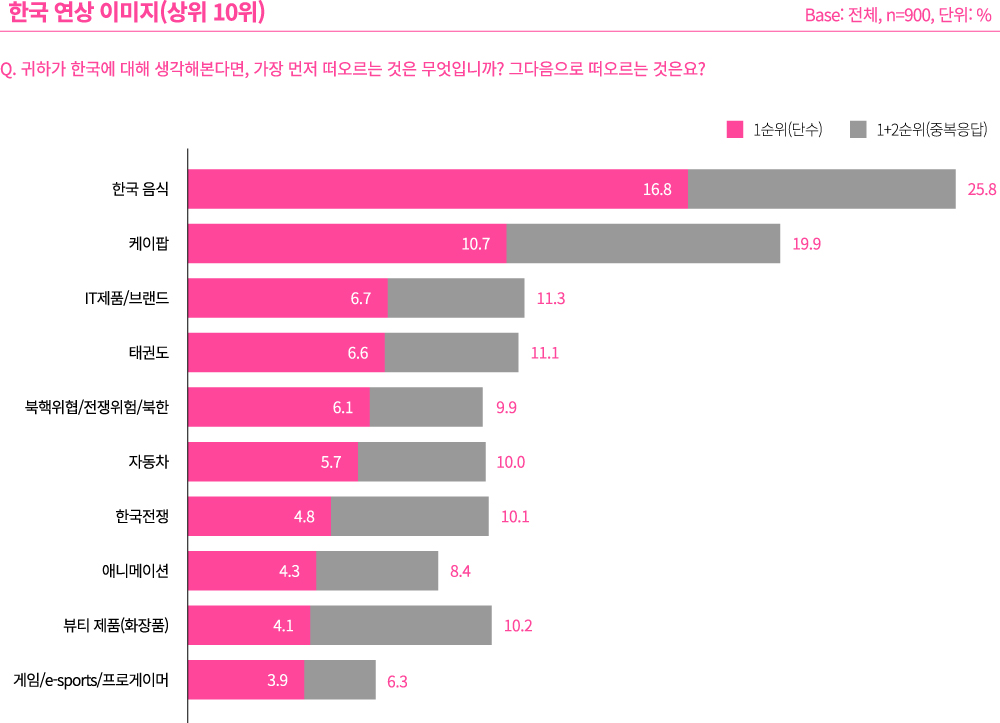 먼저 한국 최초 연상 이미지로는 한국 음식(25.8%)이 케이팝(19.9%)의 인지도를 앞섰다. 다음으로 IT 제품/브랜드(11.3%), 태권도(11.1%), 북핵위협/전쟁위험/북한(9.9%)이 뒤를 이었다. 남성의 경우 여성보다 한국을 IT제품/브랜드(8.2%), 한국전쟁(7.6%) 이미지로 연상하는 사람이 많았고, 여성은 남성보다 한국 음식(19.3%), 뷰티 제품(화장품)(7.1%) 등으로 연상하는 사람이 더 많았다. 연령별로는 10, 20대에서 케이팝 연상 비율이 높았고, 40, 50대는 한국전쟁/북한위협/전쟁위험/북한, IT제품/브랜드 연상 비율이 높았다. 글로벌 콘텐츠나 트렌드에 민감한 청년 및 여성과는 달리 중장년층에게는 독일 뉴스를 통해 접하던 한국 이미지가 여전히 강한 인상을 주고 있음을 알 수 있다.