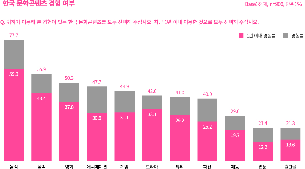 한국 음식은 한국 문화콘텐츠 경험률과 최근 1년 내 경험률에서도 각각 77.7%, 59.0%로 1위를 기록했다. 응답자 10명 중 7명 이상이 한국 음식을 접해봤으며, 지난 1년간 한국 음식을 접한 사람도 응답자의 절반 이상에 달한다는 뜻이다. 독일에서 한국 음식은 더 이상 이국적이거나 낯선 문화가 아니다. 독일의 수도 베를린을 포함, 뮌헨과 함부르크, 프랑크푸르트 등 주요 대도시에서 한국 음식은 트렌드가 된 지 오래다. 한식 시장이 성장하면서 특정 메뉴 전문점이나 파인 레스토랑 등 전문화와 세분화가 이뤄지고 있다. 한국 사람뿐 아니라 중국, 베트남 등 다양한 아시아 국적의 사람들이 운영하는 한식당도 증가 추세다. 독특한 한식당이 독일 지역 곳곳에 자리 잡고 새롭게 문을 열면서 지역 미디어에도 꾸준히 소개된다. 그만큼 접근성과 노출도가 높아지고 트렌디한 이미지를 계속해서 구축하고 있다.