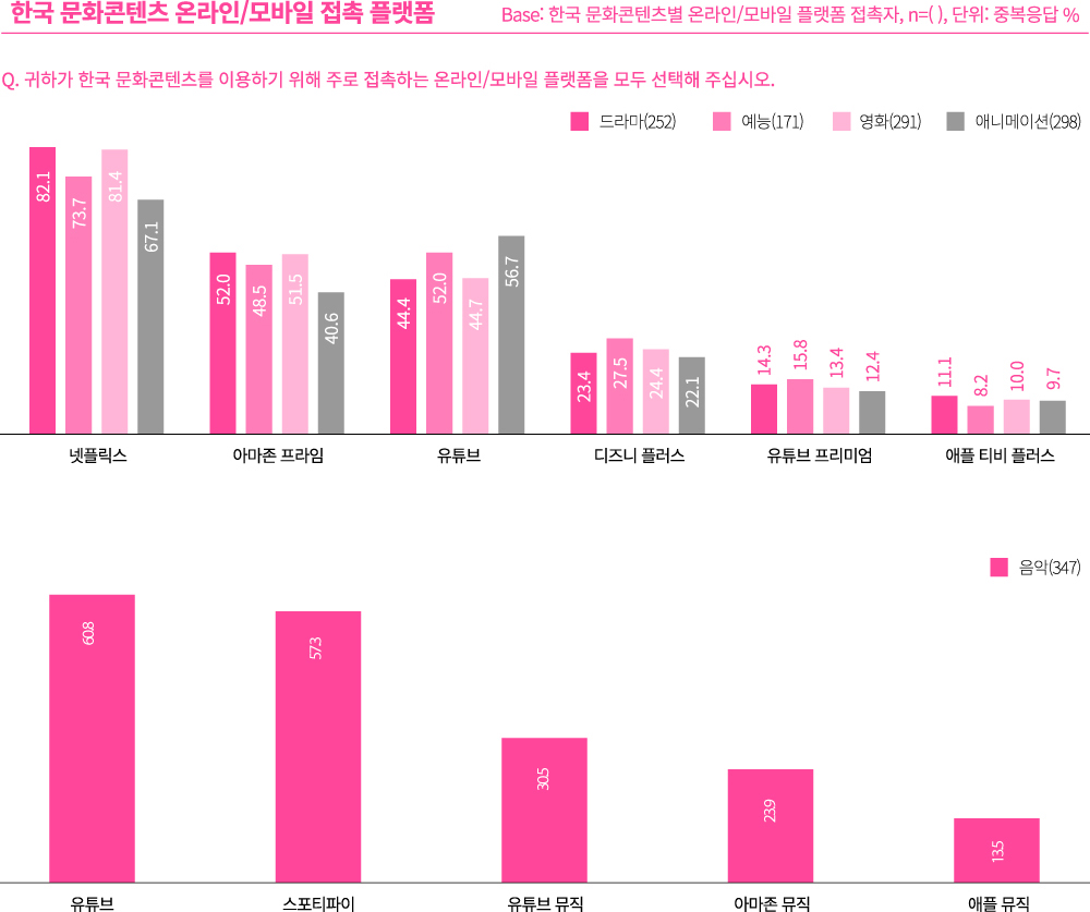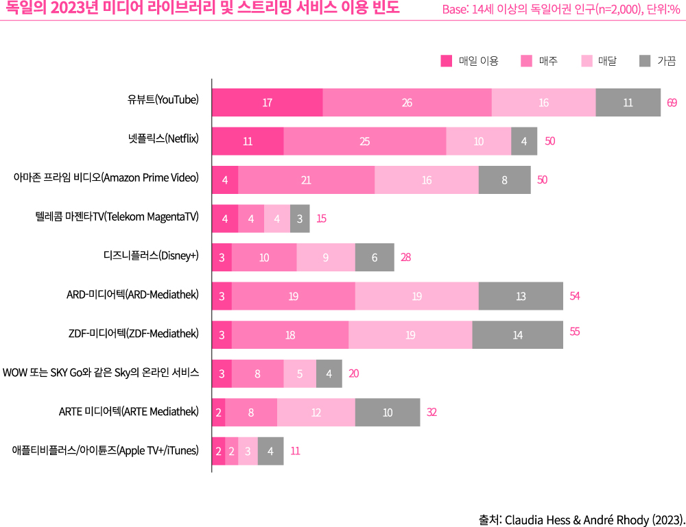 이는 독일인들의 미디어 사용 행태와 연결되는 것으로 한류 콘텐츠만의 특이성은 아니다. 독일 ARD/ZDF 온라인연구(Claudia Hess & André Rhody, 2023)에 따르면, 14세 이상 독일어 이용자의 69%가 유튜브를 사용하고 있으며, 넷플릭스와 아마존 프라임을 사용하는 이들도 응답자의 50%에 이른다. 그 외에는 독일 공영방송의 미디어 스트리밍 서비스인 ZDF, ARD, ARTE 미디어텍 등을 자주 사용한다. 글로벌 플랫폼 중심으로 한국 콘텐츠가 서비스되고 있으며, 독일 플랫폼에서는 상대적으로 한국 콘텐츠를 접하기 어렵다는 것을 알 수 있다. 독일의 공영방송 스트리밍 서비스의 경우 기존의 한류 팬을 넘어서 새로운 시청자를 확보할 수 있는 플랫폼으로 한독 공동 영화나 다큐멘터리 제작 등을 통해 노출을 확장하는 전략이 필요하다.