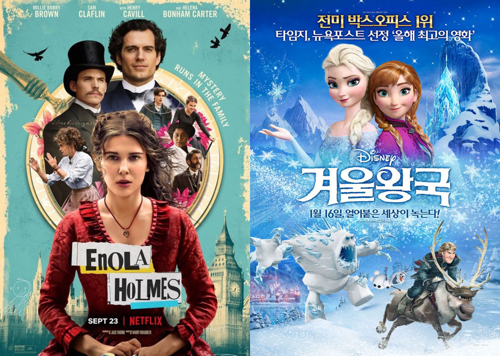 영화 <에놀라 홈즈(Enola Holmes)>(좌)와 <겨울왕국(Frozen)>(우) 포스터 (사진출처: 넷플릭스, 월트디즈니컴퍼니 코리아)