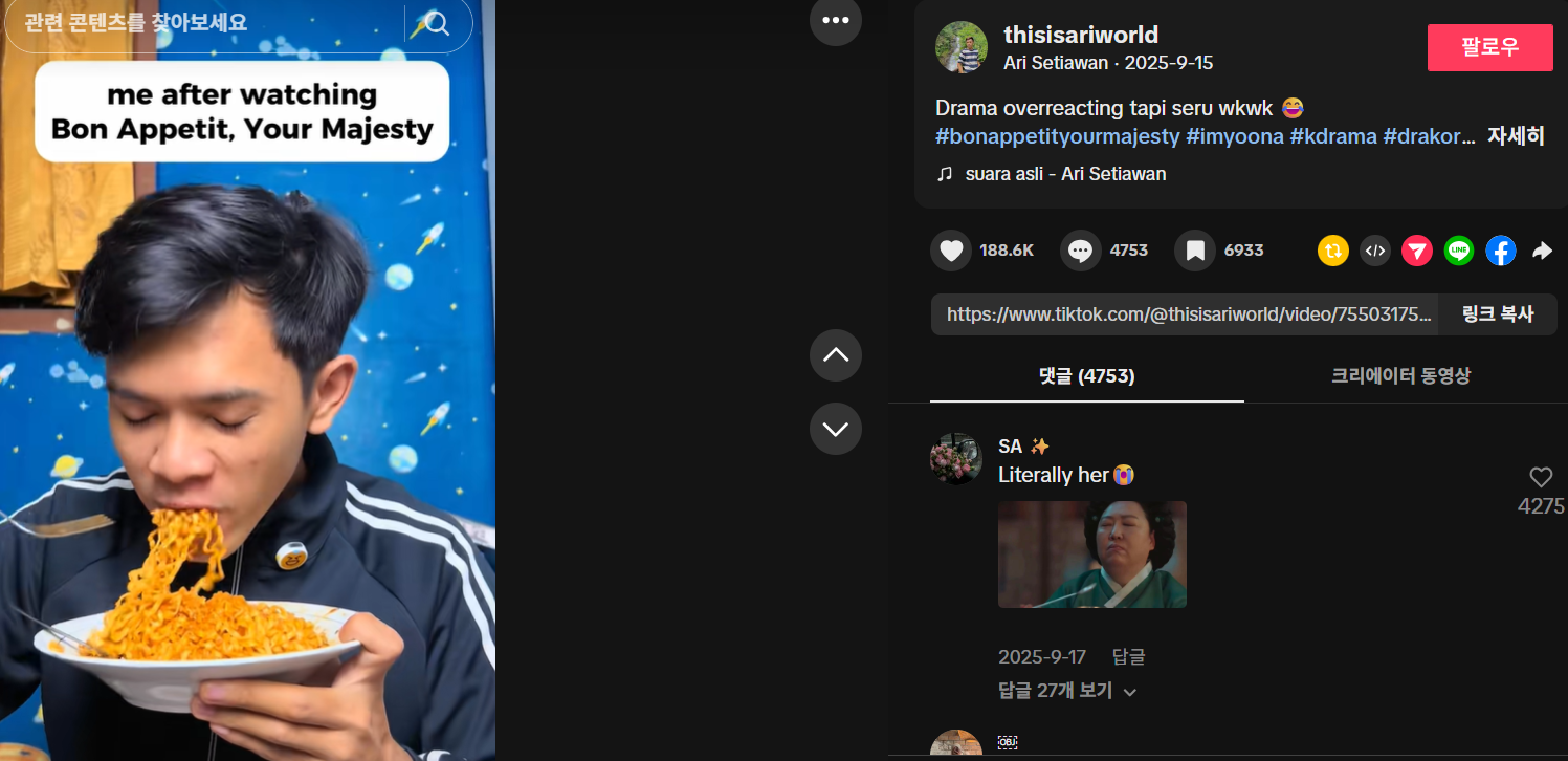 이러한 현상은 최근 K-시대극 팬덤에서 더욱 두드러진다. <폭군의 셰프>의 해외 팬들은 레딧 등에서 한국의 전통 발효 음식과 식재료의 효능을 자발적으로 정리해 공유하며 K-푸드를 적극적으로 소개한다. <정년이>의 팬들은 생소한 여성국극이라는 장르와 그 속에 담긴 한국적 소리의 미학을 서구권 시청자들에게 해설하고 번역하며, 단순한 시청자를 넘어 능동적인 문화 중개자로서 작품의 의미를 확장하고 있다.
