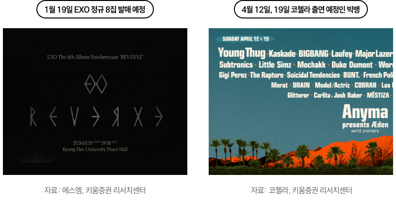 2026년, 방탄소년단과 블랙핑크를 포함한 메가 IP들의 컴백에 대한 기대가 동시에 커지고 있다. 이는 케이팝산업에서 보기 드문 '동시 회복 국면'에 해당한다. 보통 메가 IP들의 컴백과 투어 시점은 서로 엇갈리면서 업황의 변동을 완화해 왔다. 하지만 2026년은 여러 메가 IP가 비슷한 시점에 활동을 재개할 가능성이 제기되면서 산업 전체 규모가 한 단계 커질 수 있는 환경이 조성되고 있다.