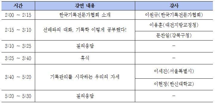 A: 이번 예비학교에서는 대학원을 졸업하고 취업한 선배와의 대화, 공공영역과 민간영역에서 기록관리를 담당하시는 선생님들이 '기록관리를 시작하는 우리의 자세'라는 주제로 짧은 강연을 진행할 예정입니다.