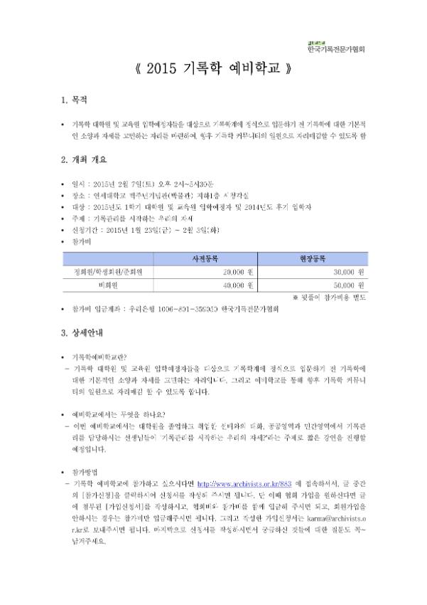 A: 기록학 예비학교는 2015년도 1학기 대학원 및 교육원 입학예정자 및 2014년도 후기 입학자를 대상으로 합니다. 또한 기록관리에 관심있는 예비 기록인들도 참가신청 가능합니다.Q: 그런데 언제 어디서 하나요?