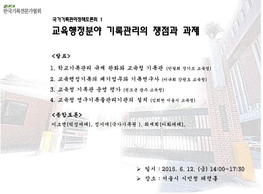 한국기록전문가협회에서는 교육행정분야 기록관리의 현황을 검토하고 이에 대한 대안을 모색하고자 토론회를 개최합니다. 기록관리의 사각지대로 볼 수 있는 교육행정분야 기록관리 이제 그 문제에 대해 좀 더 싶도 깊은 이야기를 해볼 때 입니다. 많은 분들의 관심과 참여 부탁드립니다. 참여를 원하시면 아래 참가신청을 클릭하시여 참가신청 부탁드립니다.(신청기간 6/3~6/11)