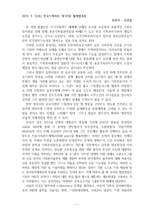 발제와 토론을 통해 현재 국가기록원이 추진하고 있는 법령 개정의 문제점 및 향후 우리의 역할 등을 검토 할 수 있는 자리였습니다. 토론 내용은 별도로 요약하지 않고 발제문만 아래 파일로 첨부합니다. 앞으로도 한국기록전문가협회서는 법령 개정과 관련하여 지속적으로 관심을 보일 예정입니다.