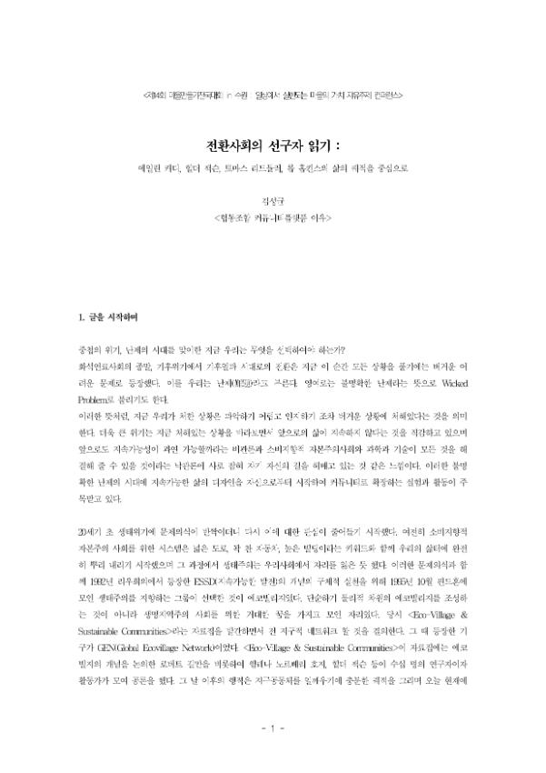 - 전환사회의 선구자 읽기 : 에일린 캐디, 힐더 잭슨, 토마스 리드뮬러, 롭 홉킨스의 삶의 궤적을 중심으로