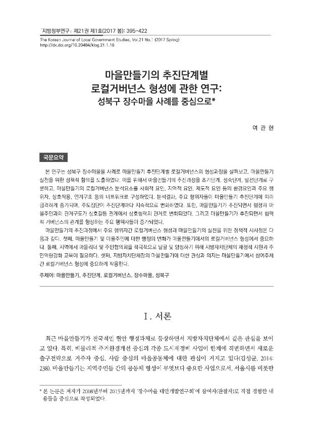 여관현(2017). 마을만들기의 추진단계별 로컬거버넌스 형성에 관한 연구 : 성북구 장수마을 사례를 중심으로