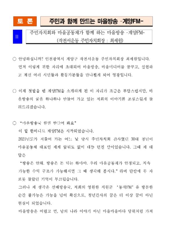 - 토론1. 최세원(작전서운동 주민자치회장), 주민자치회와 마을공동체가 함께하는 마을방송, 계양FM
