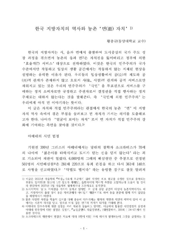 이 글은 자치와 직접 민주주의라는 관점에서 한국의 농촌 ‘면’이 지방 자치 역사 속에서 겪은 부침을 살펴보고 면 자치가 가지는 의미를 도출해보 고자 한다. 나아가 ‘얼굴이 보이는 자치’로서 면 자치가 직접 민주주의 강 화에 기여하는 측면을 찾아볼 것이다.3)