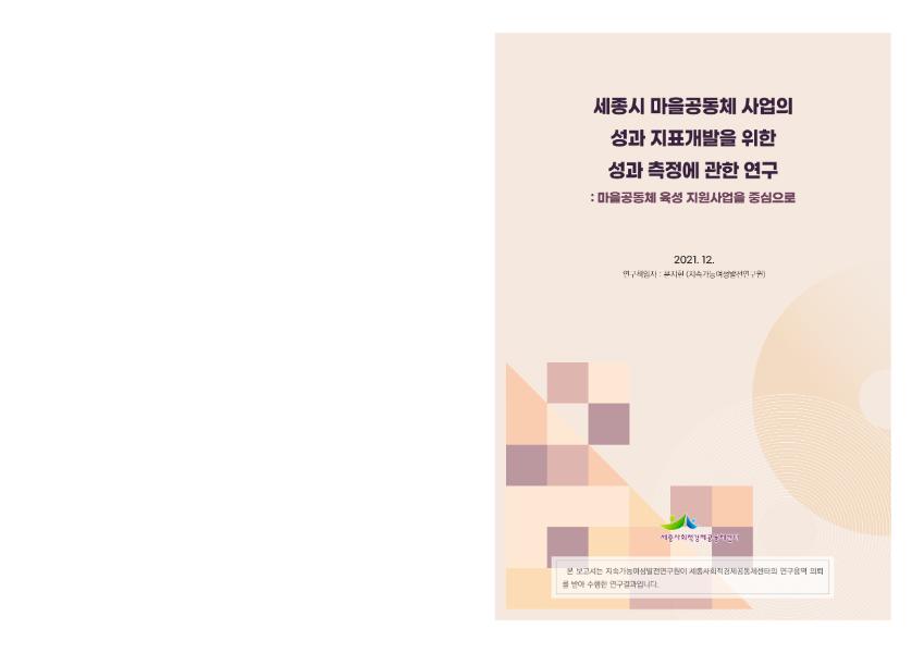 본 연구는 세종시에서 진행해 온 마을공동체 활동에 대한 성과를 평가해 보고 성과지표를 개발하고자 함. 연구의 대상은 세종 시의 마을공동체 육성 지원사업에 선정된 공동체의 활동가와 참여자들, 행정기관과 마을공동체 중간지원조직 담당자, 마을공 동체사업관련 전문가들을 대상으로 하였음. 세종시마을공동체사업의 성과를 평가하기 위하여 문헌연구, 설문조사, 사업의 결 과보고서 분석, FGD, 방송인터뷰, 참여적 관찰, 행정자료, 세종사회적경제공동체센터의 내부자료 등을 활용하여 정량적 · 정성 적 분석 방법을 시도하였음. 본 연구에서는 논리모델과 설문조사를 통한 요인분석을 통합적으로 정리 · 해석하여 성과측정 항 목을 만들고 시범적 성과지표를 도출함. 연구내용의 분석 기간은 제1기 마을공동체기본계획이 적용되는 2017년부터 2021년 까지의 활동을 중심으로 살펴보았음.