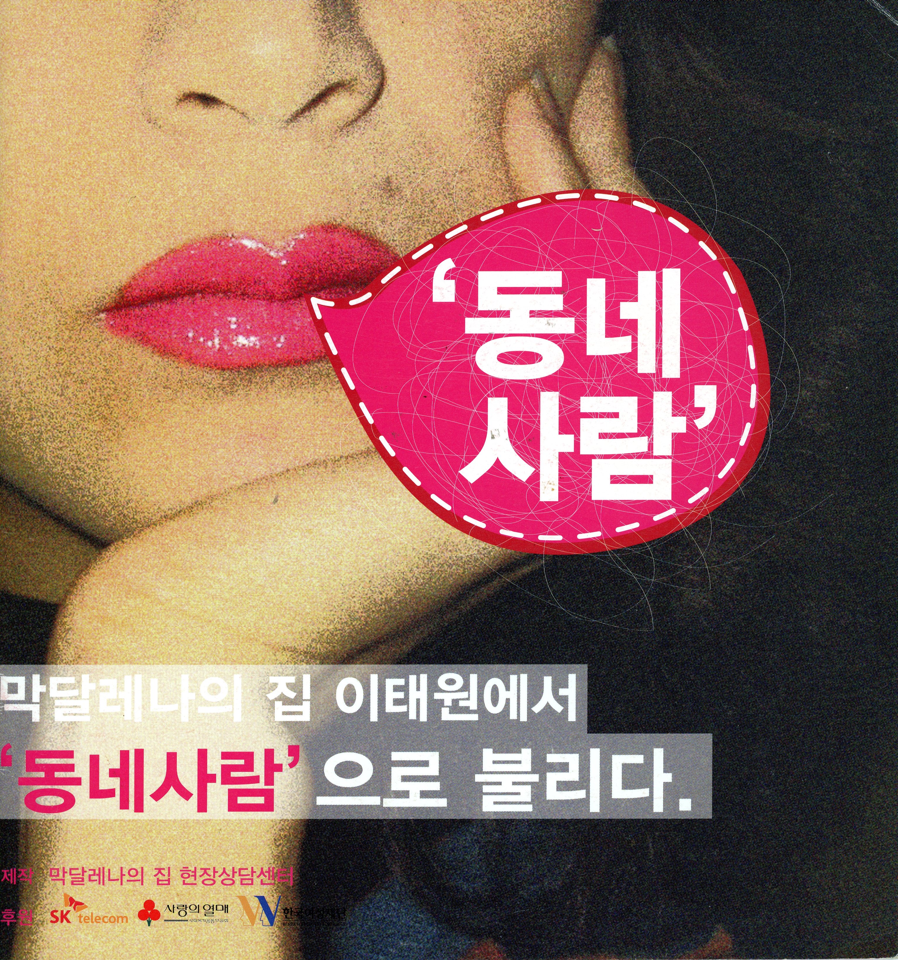 2008년 11월, 막달레나공동체가 만든 간행물 "막달레나공동체 이태원에서 '동네사람'으로 불리다"의 표지이다. 이 간행물은 2007년부터 한국여성재단 공모사업으로 진행된 막달레나공동체 현장상담센터 부설 이태원 사랑방의 사업을 소개한 책자이다. 2007년과 2008년의 이태원 사랑방의 활동 내용이 담겨있다.