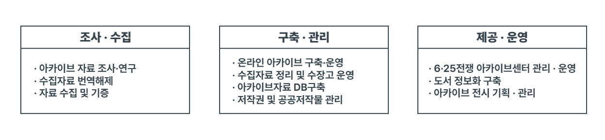 “전쟁기념관 학예부 아카이브 센터 내에는 학예연구사, 기록연구사, 사서 등 아카이브 구축을 위한 다양한 전문가들이 배치되어 있습니다. 아카이브센터 내에는 아카이브 자료 조사·수집, 아카이브 자료 보존·관리, 온라인 아카이브 구축·운영, 아카이브센터 관리·운영, 전쟁사 관련 콘텐츠 개발 등 ‘수집 → 관리 → 활용’ 이라는 아카이브 업무 프로세스에 맞게 체계적으로 진행되고 있습니다.