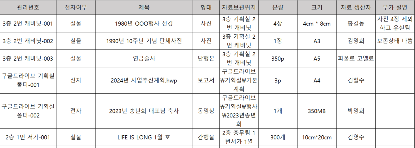 1. 관리번호: 관리번호는 자료를 식별하는 ID와 같습니다. 자료의 양이 적을 경우 <001>과 같이 자료를 확인한 순서대로 붙여도 되고요. 자료가 많은 경우 <3층 2번 캐비닛-001>, 또는 <구글드라이브 기획실 폴더-001> 과 같이 위치정보를 함께 써두면 나중에 찾기 쉽습니다. 2. 실물자료, 전자자료 여부