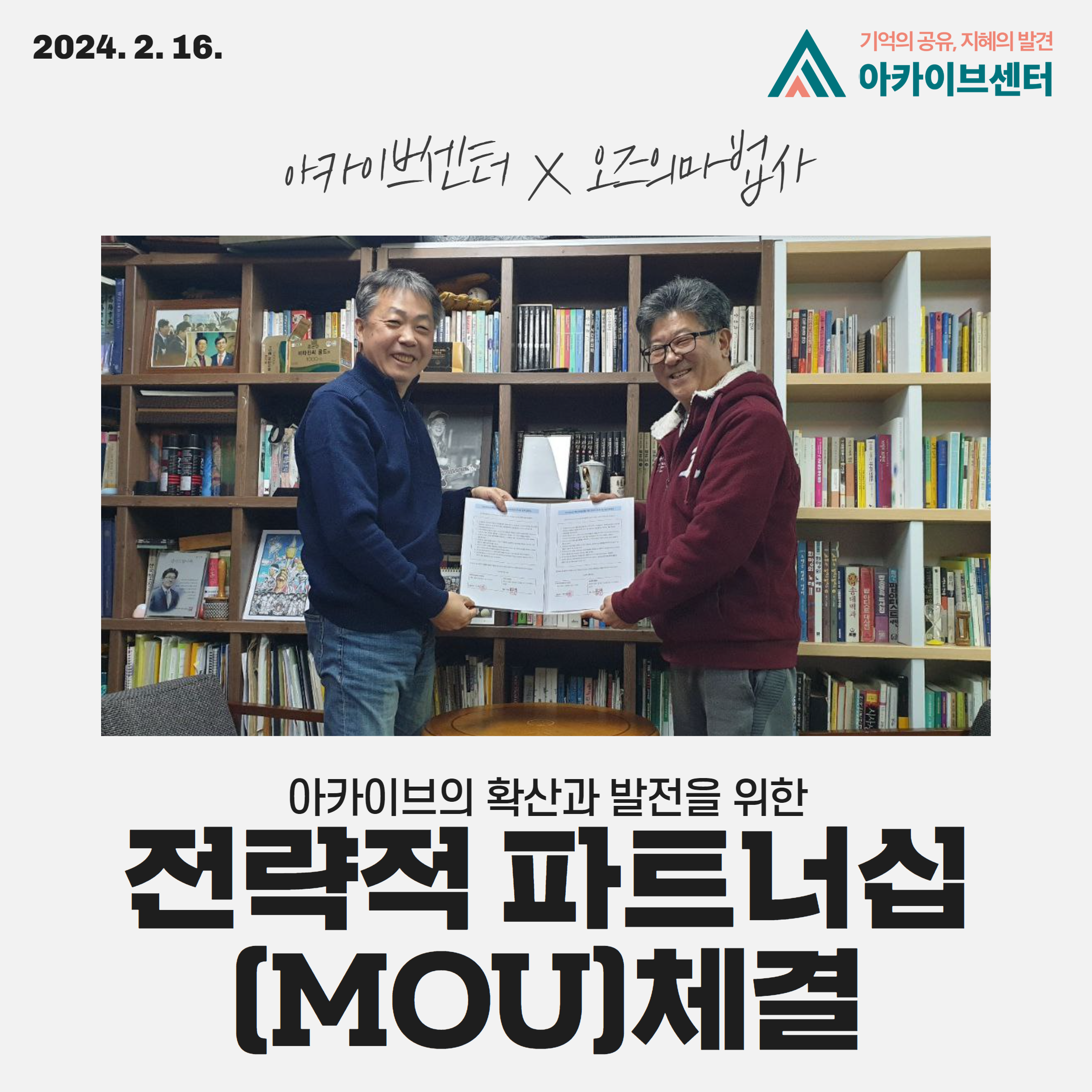 2024년 아카이브센터의 첫 파트너는 경기도 고양시에서 활동하는 ‘오즈의 마법사’입니다. 지난 2월 16일 오즈의 마법사와 함께 <아카이브 확산과 발전을 위한 전략적 파트너십 업무 협약>을 체결하였습니다. 오즈의 마법사는 고양 지역을 기반으로 역사와 문화, 인물과 예술을 아우르는 다양한 영역에 종사하고 있는 회사입니다. 지역사회의 공동체 문화를 기억한다는 모토를 가지고 있습니다. 영상, 출판, 미디어 등 콘텐츠 사업에서 큰 영향력을 발휘하고 있습니다. 이번 파트너십 체결을 통해 경기도 고양을 중심으로 펼쳐질 콘텐츠와 아카이브의 결합을 기대해 주세요!