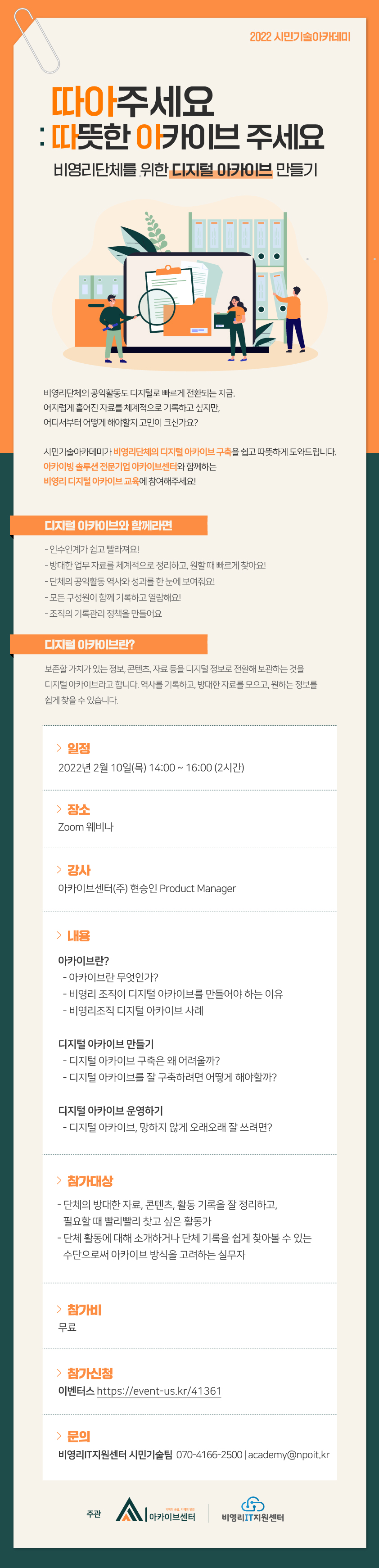 2022년 2월 10일 아카이브센터와 비영리IT지원센터와 함께한 "따아주세요" 입문교육이 온라인으로 진행되었습니다!