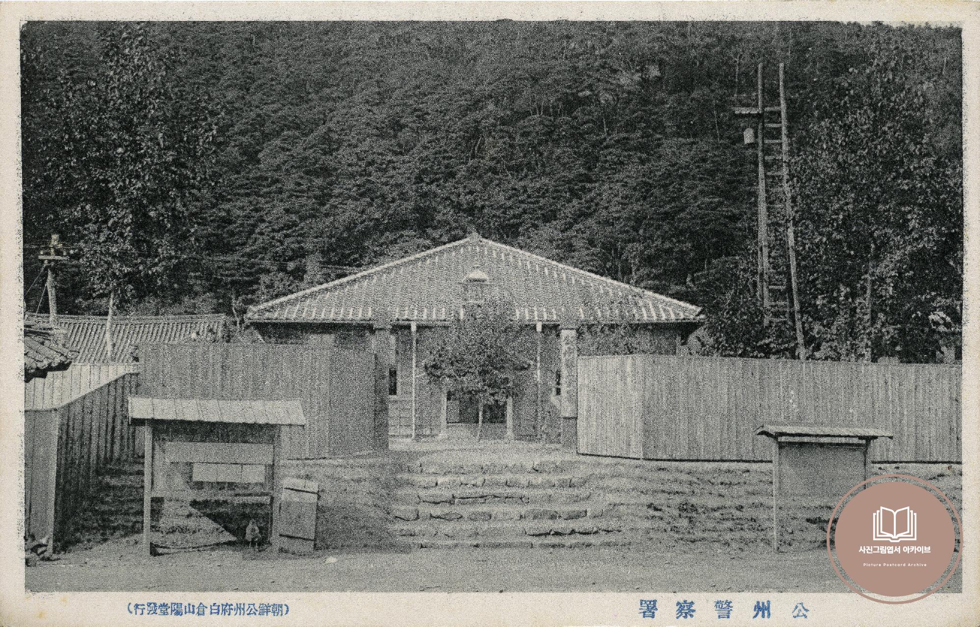 1910년대 발행된 것으로 추정되는 공주경찰서 사진그림엽서이다. 공주경찰서는 충청남도 도청이 소재한 공주에 위치했기에 그 기능과 위상이 오늘날 광역경찰급에 해당했다. 경찰서 설립 초기에는 오늘날의 국립공주대학교 사범대학 부설 고등학교 북측의 봉황산 밑에 위치했으나, 점차 장소의 협소함 등을 이유로 오늘날 공주문화원 부근으로 이전했다. 따라서 본 기록물 속 공주경찰서는 1922년 경찰서 이전 전의 모습으로 확인할 수 있다.