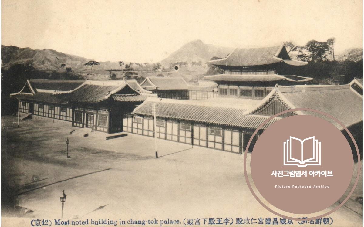 1920년대 경성의 대표적인 엽서 발행처 '일출상행(히노데)'에서 발행한 조선명소 시리즈 중 창덕궁 인정전의 모습을 담은 사진그림엽서이다. 조선명소 시리즈 중 42京에 해당하는 자료이며, 창덕궁 인정전과 전각, 개항기 근대적 궐내로 개조된 인정문 앞 도로 구획을 확인할 수 있다. 나아가 궐 내에 가스등과 전신주가 설치된 모습이 인상적이다.
