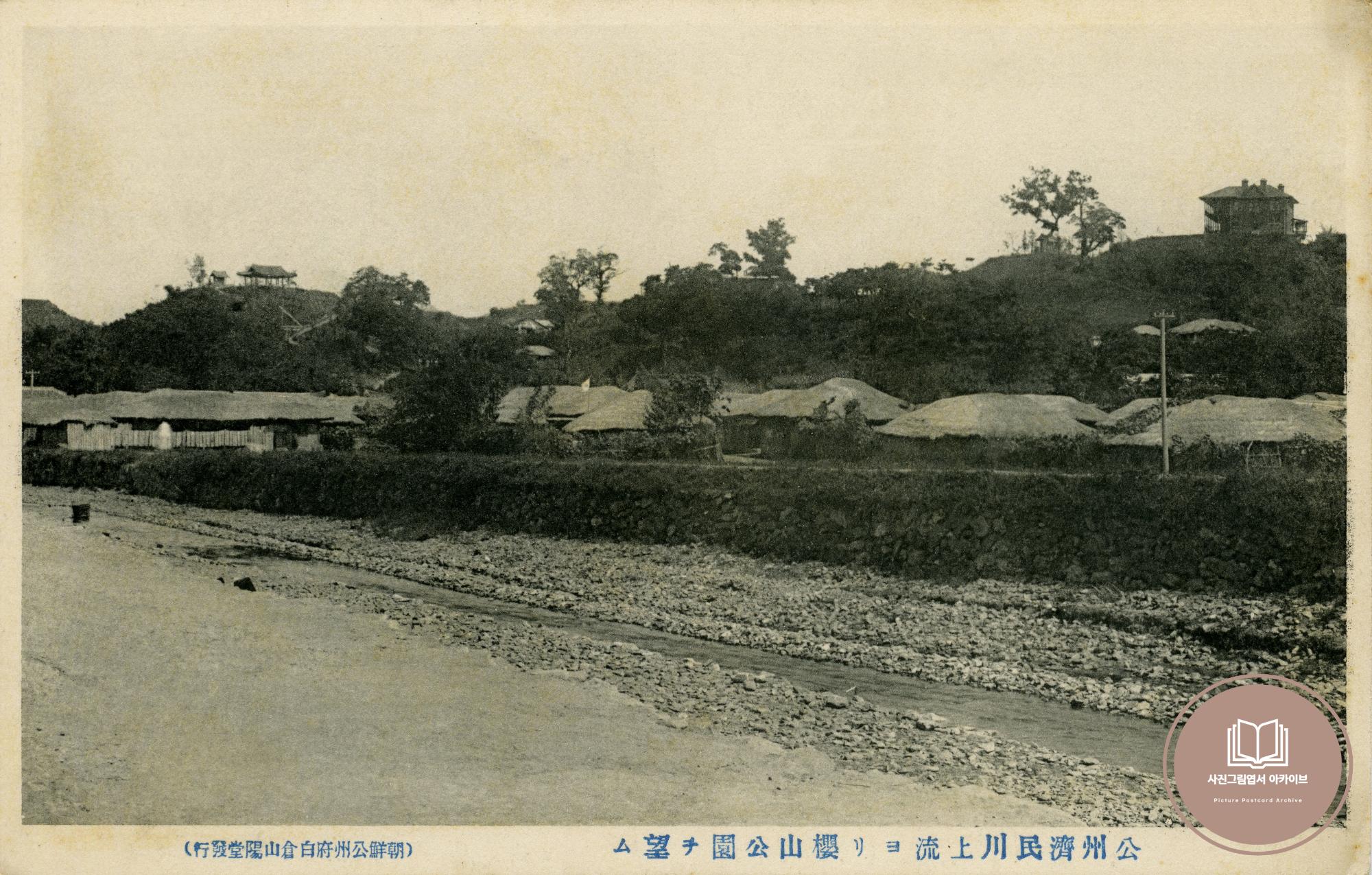 1920년대 초반, 공주 제민천 상류 제방길 일원에서 오늘날의 영명학교과 중앙공원 부근을 바라본 구도의 사진그림엽서이다. 1917년 금강 대홍수로 인해 제민천 일원은 상하류 관계 없이 모두 제방이 무너지고 시가지 구역에 홍수가 발생하는 물난리를 겪었다. 이후 1918~19년까지 약 2년에 걸쳐 제방공사와 수해방지시설 가설 등의 복구공사를 진행했는데, 본 기록 속 제방 부근의 하천은 오늘날 직강화 공사 직후의 모습처럼 수생식물 하나 없이 돌과 자갈이 잘 정돈된 것을 확인할 수 있다.