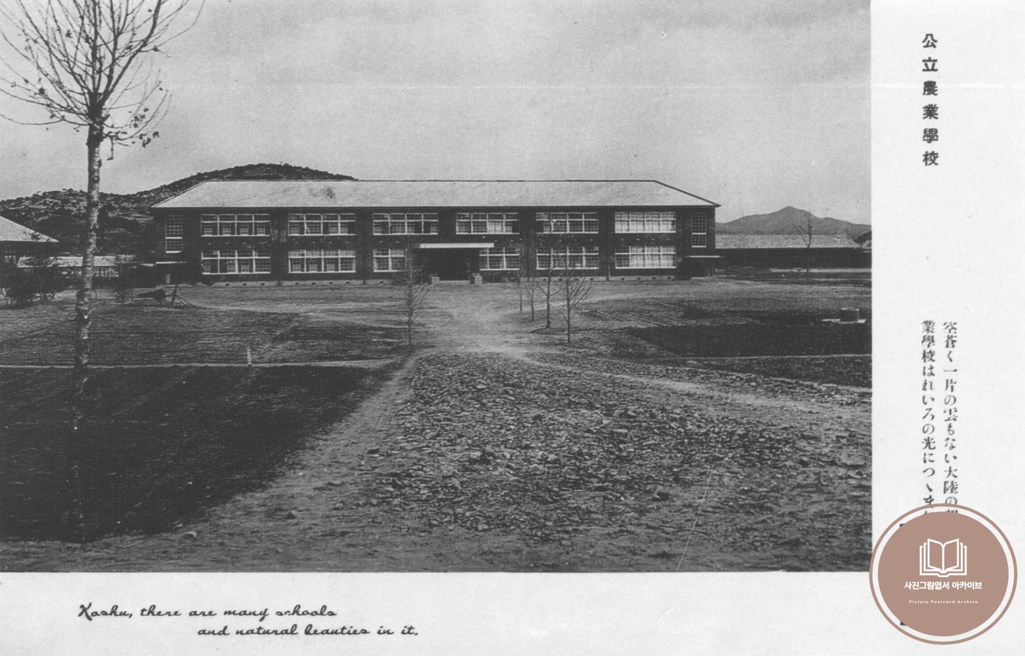 1930년대 중후반, 경성의 대표적 사진그림엽서 발행처 중 하나인 일출상행(히노데, 日之出常行)에서 발행한 '공주대관(公州大觀)' 시리즈 중 공주공립농업학교(現, 공주생명과학고등학교) 모습이 담긴 기록이다. 공주공립농업학교는 1933~34년 사이 현재의 공주사대부고 자리에서 개교하며 역사가 시작된다. 이후 1938년 금강교 북단 신관동 전막 부근으로 학교가 이전 개교하는데, 본 기록 속 모습은 전막으로 이전한 후의 모습을 담고있다.