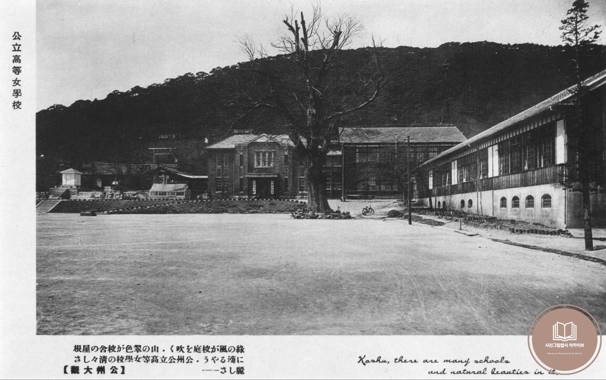 1930년대 중후반경, 경성 대표 사진그림엽서 발행처 중 한 곳인 일출상행(히노데, 日之出常行)에서 발행한 '공주대관(公州大觀)' 시리즈 중 공주공립고등여학교 모습이 담긴 기록이다. 공주공립고등여학교는 본래 신관동 전막에 있었으나, 공주공립농업학교와 부지를 맞바꾸어 본 기록 속 모습처럼 봉황산 자락 아래의 위치로 이전했다.