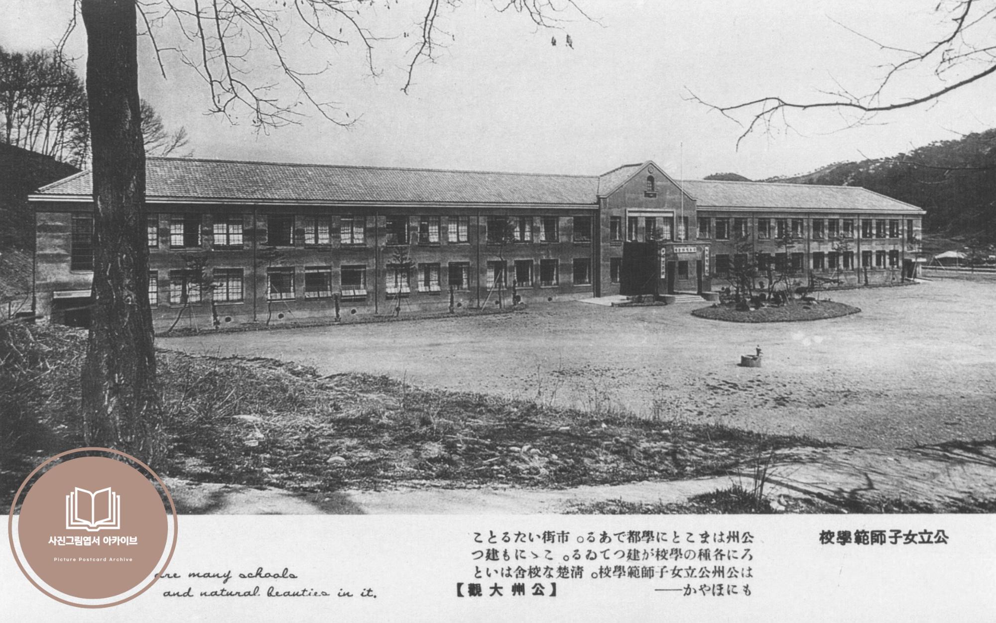 1930년대 중후반, 경성 대표 사진그림엽서 발행처인 일출상행(日之出常行)에서 발행한 '공주대관(公州大觀)' 시리즈 중 공주공립여자사범학교(現, 공주교육대학교) 모습이 담긴 기록이다. 공주공립여자사범학교는 1938년 일락산 자락 아래의 현 공주교육대학교 부지에 건립되었고, 본래는 기록에서 볼 수 있듯이 여자사범학교로 출범했다.