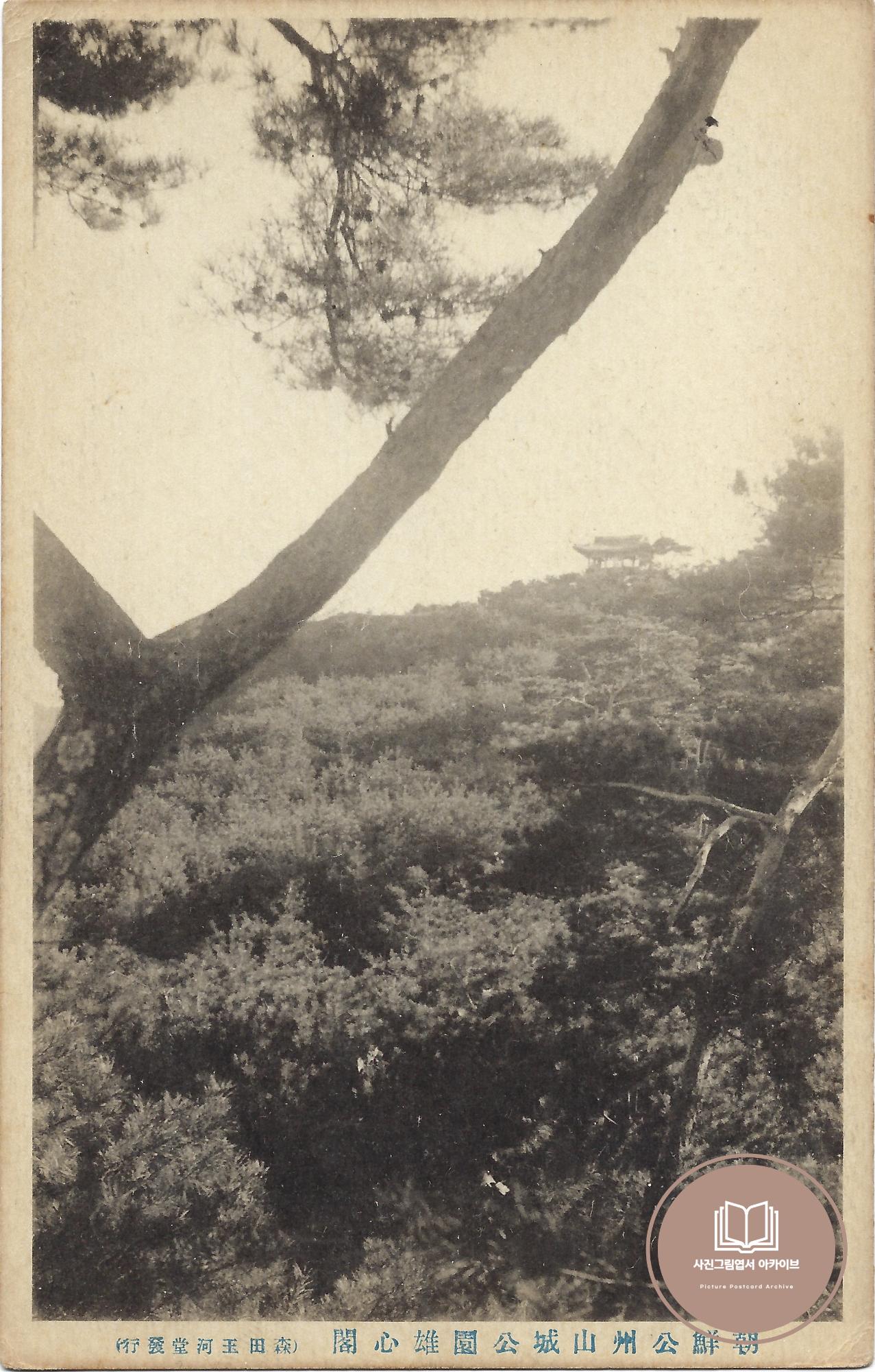 1910년대 공주의 제과점인 삼전옥하당(森田玉河堂)에서 발행한 공산성 광복루를 바라본 구도가 담긴 사진그림엽서이다. 광복루는 공산성 내 가장 높은 언덕에 위치한 누각으로 본래 충청병영 중군영의 부속 건물 중 하나인 해상루였으나, 1907년 대한제국 군대 해산과 1910년 경술국치 이후 중군영이 훼철되어 일제에 의해 높은 곳에서 경치를 조망할 수 있는 누각으로 그 용도가 달라졌다. 해상루는 일제에 의해 명칭이 웅심각으로 변경되었다가 광복 이후 공주를 방문한 김구 선생에 의해 광복루로 개칭되어 오늘날에 이른다.
