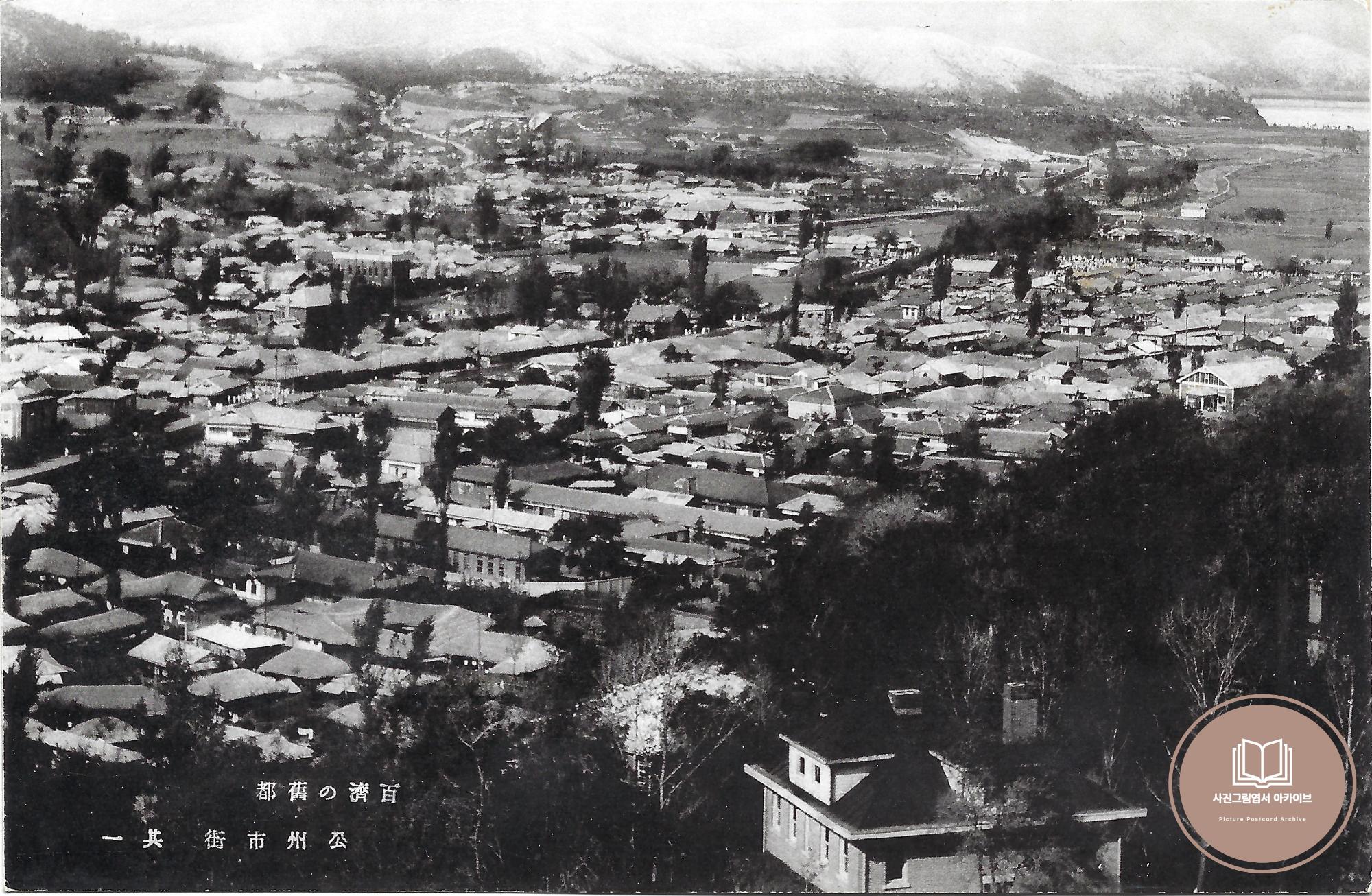 1930년대 조선공주고적보존회(朝鮮公州古跡保存會)에서 발행한 '백제의 구도 공주 명승 회엽서' 세트 중 공주시가지 전경을 담은 첫번째 자료이다. '其 1'이라는 명칭이 작성되어 있는 것으로 보아 2~3에 해당하는 전경 사진그림엽서가 파노라마 형식으로 존재했을 것으로 추정된다. 본 자료의 중앙 하단에는 현재도 남아있는 영명학교 뒷편의 선교사 가옥의 모습을 확인할 수 있으며, 그 아래로 내려오면 一자형의 회랑 구조를 지닌 공주자혜병원(충남도립공주의원)의 전염병동을 비롯하여 객사가 사라진 자리에 건축된 공주보통학교(現, 공주중동초등학교) 모습도 확인할 수 있다. 또한, 중앙 상단부의 높은 담장이 口자형으로 이뤄진 공주형무소(現, 공주교도소)의 모습도 살펴볼 수 있다.