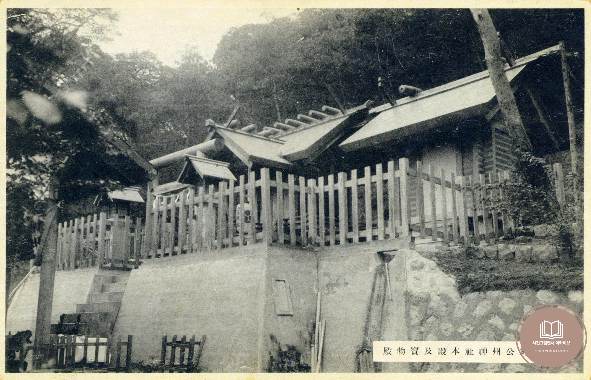 1940년 공주신사에서 발행한 '조선 공주신사 대관' 사진그림엽서 세트 중 공주신사 본전과 보물전 모습이 담긴 기록이다. 공주신사는 조선신궁 관할 신사 중 한곳으로 대신궁으로도 불리었다.