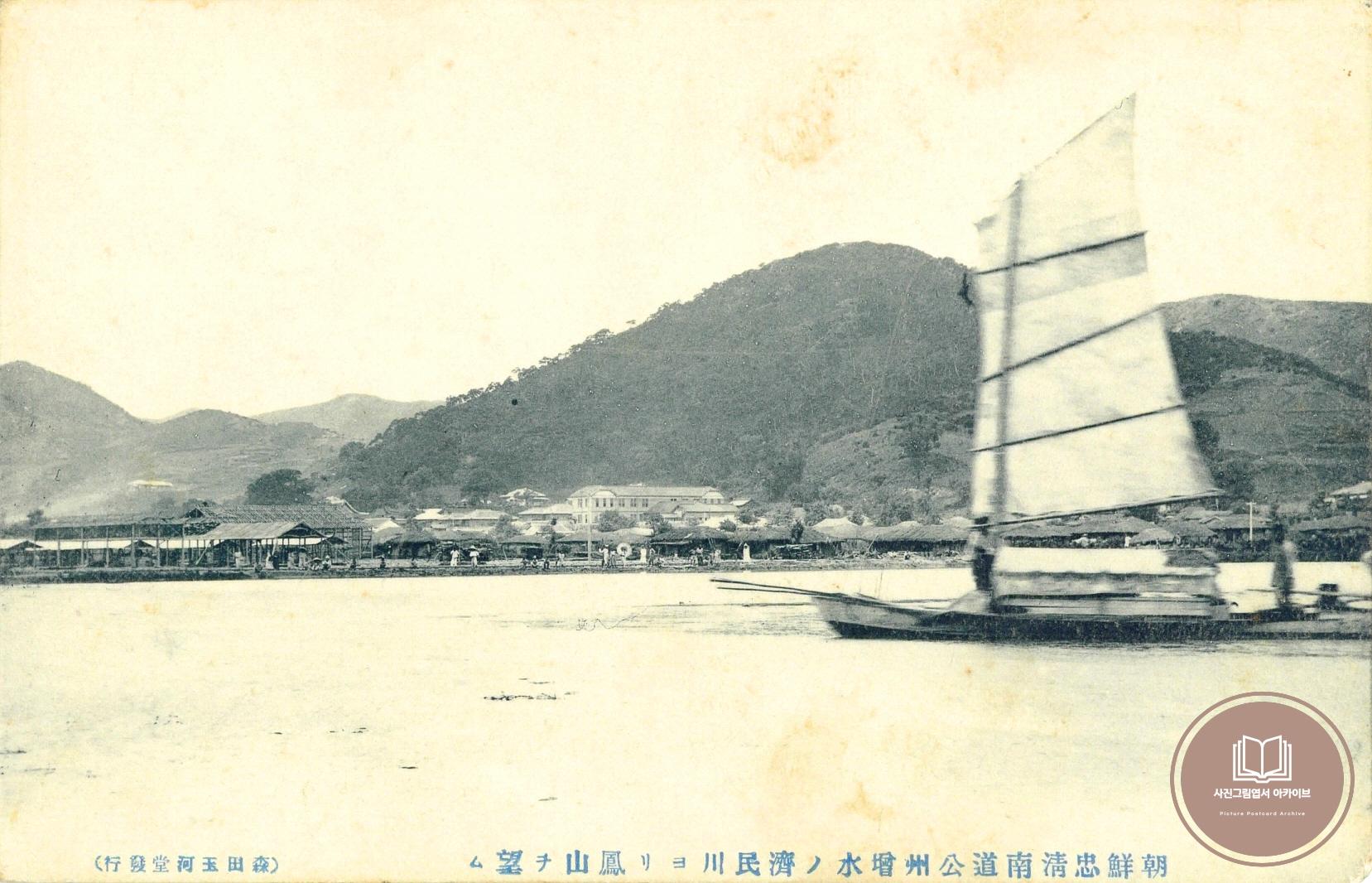 1917년 공주 대홍수로 인해 범람한 제민천 하류 일대의 풍경을 담은 사진그림엽서이다. 1917년 유래없는 대홍수는 공주시가지를 관통하여 흐르는 제민천 하류 제방을 붕괴시켰고, 그 결과 금강물까지 역류하여 지금의 공주산성시장 일원이 모두 물에 잠기는 사태에 빠졌다. 본 사진그림엽서는 당시의 상황을 기록한 것으로 추정되며, 하류의 미나리꽝 일원에 돛을 올린 평저선이 들어올 정도로 수위가 높았던 것을 보여준다. 자료 중간의 봉황산을 확인할 수 있고, 봉황산 아래 중간부근의 공주지방법원 본청 모습도 볼 수 있다.