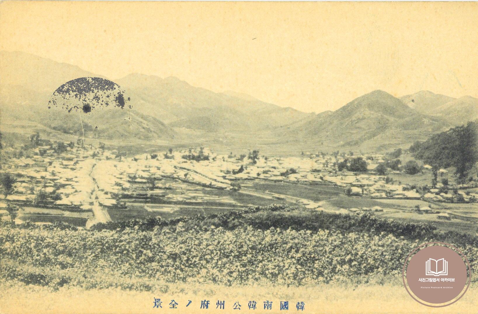 1909년 공산성 남쪽 성벽 부근에서 공주 시가지 모습을 조망한 사진그림엽서이다. 군산천엽상점(群山千葉商店)에서 발행한 본 사진그림엽서는 본래 1909년 군산이사청에서 발간한 '군산부근사진첩' 속에 수록된 공주 시가지 사진을 가공하여 제작한 것이다. 근대적 관공시설이 들어서기 이전의 충청수부 공주의 모습을 확인할 수 있으며, 본정과 욱정으로 일제강점기에 일컬어지던 시가지 일원의 넓은 신작로가 조성되기 이전의 모습도 살펴볼 수 있는 자료이다.