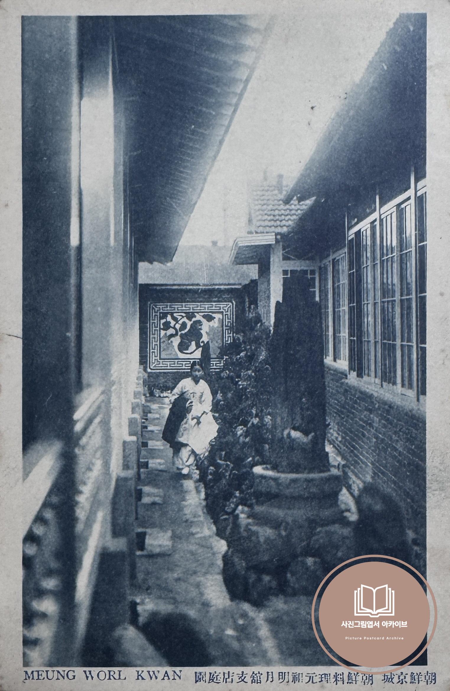 1913년 서울 종로구 세종로 일원에 소재한 조선 요리 전문점 명월관(明月館)의 지점 개설을 기념하여 배포한 사진그림엽서로 명월관 지점 중앙의 정원 모습을 담고있다. 명월관은 1903년 안순환이 조선 요리 전문점으로 개업한 후 1909년부터 궁중 기녀들이 모여들며 번창하기 시작한 최초의 한정식 전문점이다.