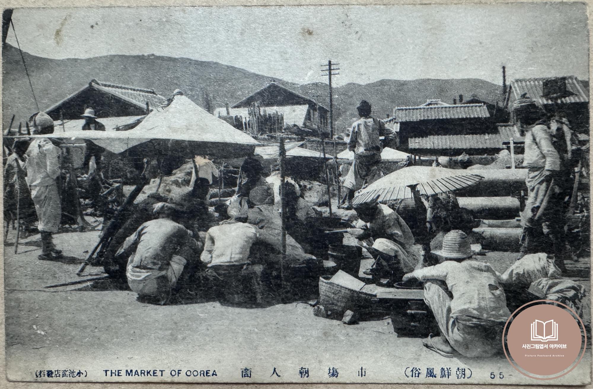 1910년대 부산의 소지상점(고이케상점, 小池商店)에서 발행한 조선풍속 엽서 10매 중 시장의 조선상인 모습이 담긴 자료이다. 시장 내 햇빛을 피하기 위해 종이 우산과 차양 아래에 옹기종기 모여든 상인 모습을 확인할 수 있다.
