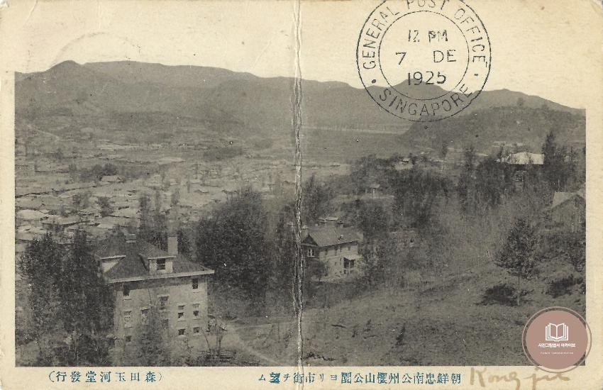 1925년 12월 7일 싱가포르 우편사무소 인장이 날인된 공주 시가지와 선교사 가옥 사진그림엽서이다. 미국인 선교사 가옥 2채의 모습을 확인할 수 있고, 공주시내 중심부를 흐르는 제민천 하류가 개간되어 미나리꽝으로 조성된 모습을 확인할 수 있다. 나아가 공산성 일대의 모습과 연미산 능선 모습도 함께 살펴볼 수 있는 엽서이다.