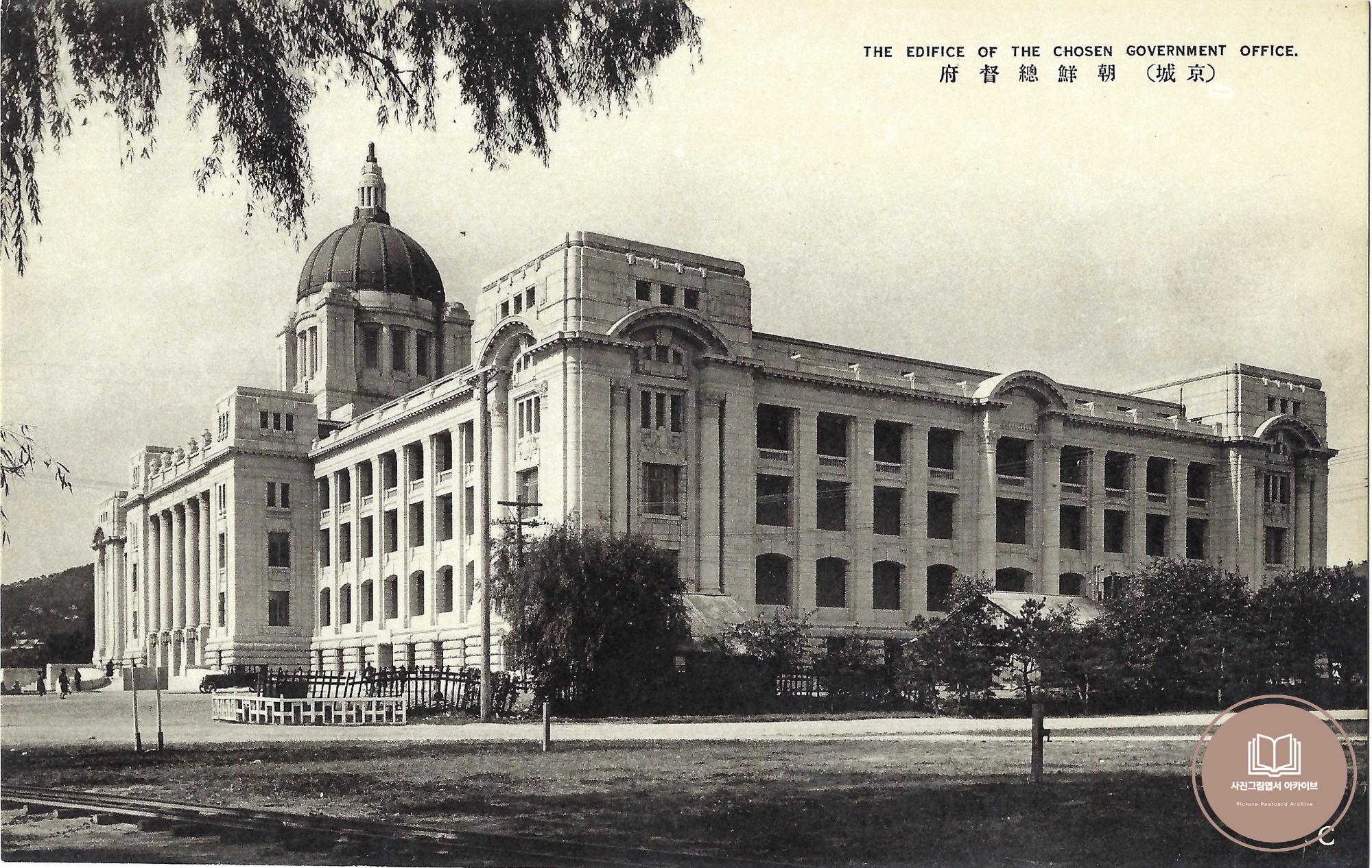 1930년대 다이쇼사진공예소(大正寫眞工藝所)에서 발행한 것으로 추정되는 '정치경제백선의 중심 - 경성부 명승집' 사진그림엽서 13장 중 조선총독부 청사 전경이 수록된 자료이다. 조선총독부는 1910년 경술국치 이후 일제의 식민지배를 위한 통치기구로 각종 식민지배를 위한 정치, 경제, 문화 등의 모든 것을 지배하던 기관이었다. 본래 남산 아래에 위치한 통감부 청사를 총독부 청사로 사용하다가 1926년 사무공간 부족 등의 이유로 조선의 법궁인 경복궁 흥례문과 그 주변을 철거하여 본 자료 속 조선총독부 청사를 새롭게 건립한다. 1945년 광복 이후 대한민국 정부중앙청사와 국립중앙박물관 등으로 활용되던 총독부 청사는 1994년 역사바로세우기 작업의 일환으로 철거되었다.