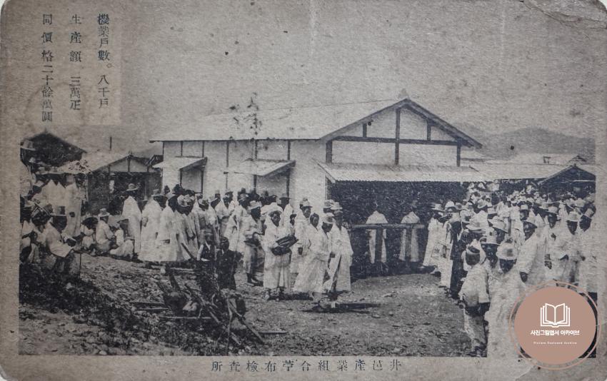 1920년대 전라북도 정읍에 위치한 정읍산업조합 저포검사소 풍경을 수록한 사진그림엽서이다. 정읍산업조합은 정읍의 저포생산을 관장하던 기구로 '정읍저포조합'으로도 불리었다. 흔히 모시옷의 원료로 활용된 저포(苧布)는 전라북도 정읍 일원의 주요 생산품 중 하나였다. 본 자료 좌측 상단에는 1920년 무렵의 정읍 기업호수와 생산량, 생산총액이 함께 병기된 것이 특징이다.