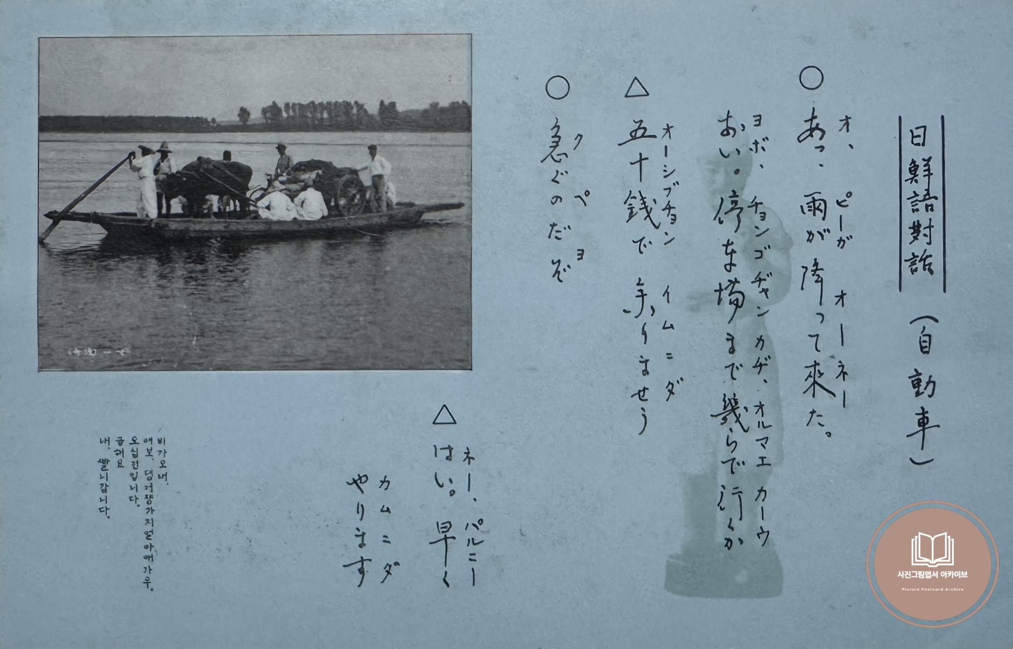 1910년대 일출상행(日之出商行)에서 발행한 회활자재 조선의 말(會活自在朝鮮のことば) 사진그림엽서 8매 세트 중 자동차를 탑승했을 때 표현할 수 있는 한국어 회화방법이 수록된 자료이다. 엽서 좌측 상단에는 강을 건너는 나룻배 위의 사람들과 소달구지 모습이 담겨있다.