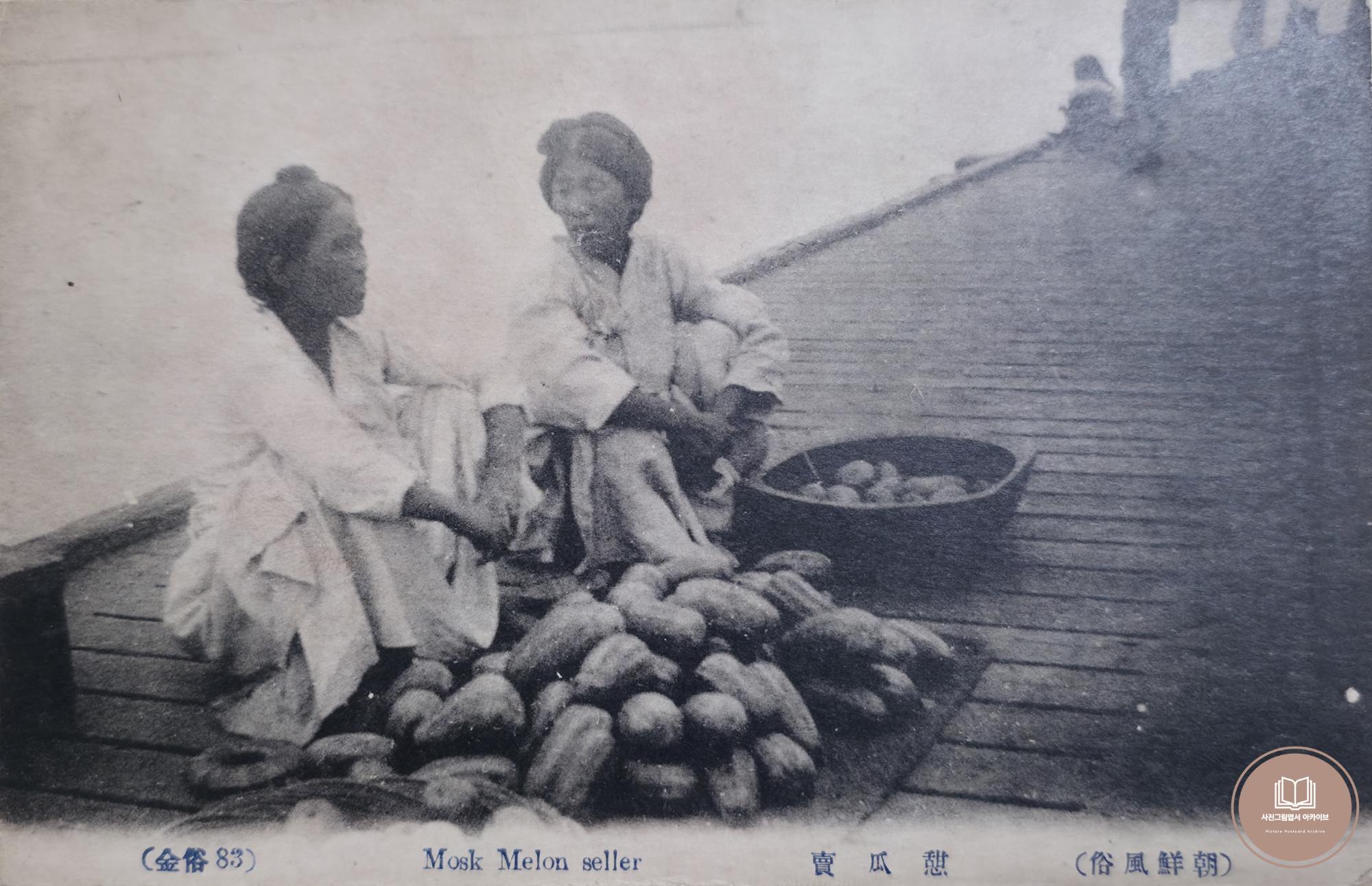 1910년대 일출상행(日之出商行)에서 발행한 조선풍속 사진그림엽서 시리즈 중 노점에서 참외를 판매하는 아낙네 모습이 담긴 자료이다. 참외의 정식 영어식 표기가 당시에는 존재하지 않아서인지 참외를 'Mosk Melon'으로 지칭한 것이 독특하다.