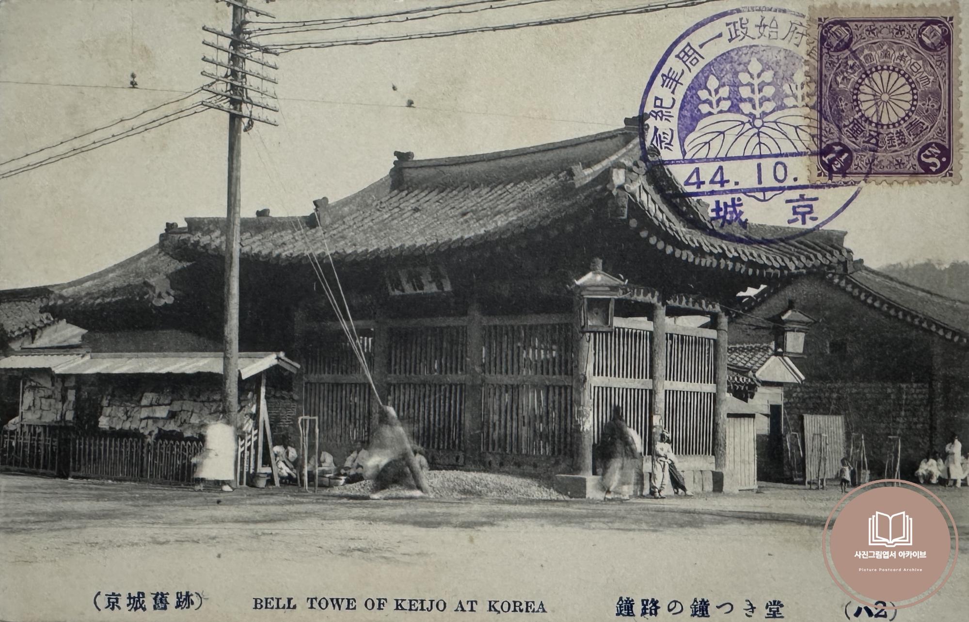 1911년 10월 1일 조선총독부 시정 1주년 기념 인장이 날인된 경성구적 사진그림엽서 시리즈 중 종로의 보신각 모습이 담긴 자료이다. 오늘날 보신각의 모습과 달리 작은 기와쥐붕 형태의 종루 모습을 확인할 수 있다.