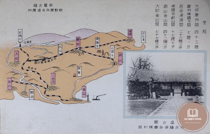 1913년 경주고적보존회에서 발행한 신라고적 조선 경상북도 경주에 관한 내용이 수록된 사진그림엽서이다. 조선의 주요 도시에서 경주로 오가는 거리와 약도가 표시된 것이 특징이며, 우측 하단에는 1913년 경주고적보존회에서 신라 유산 보존을 명분으로 건립한 온고각 건물이 담겨있다.