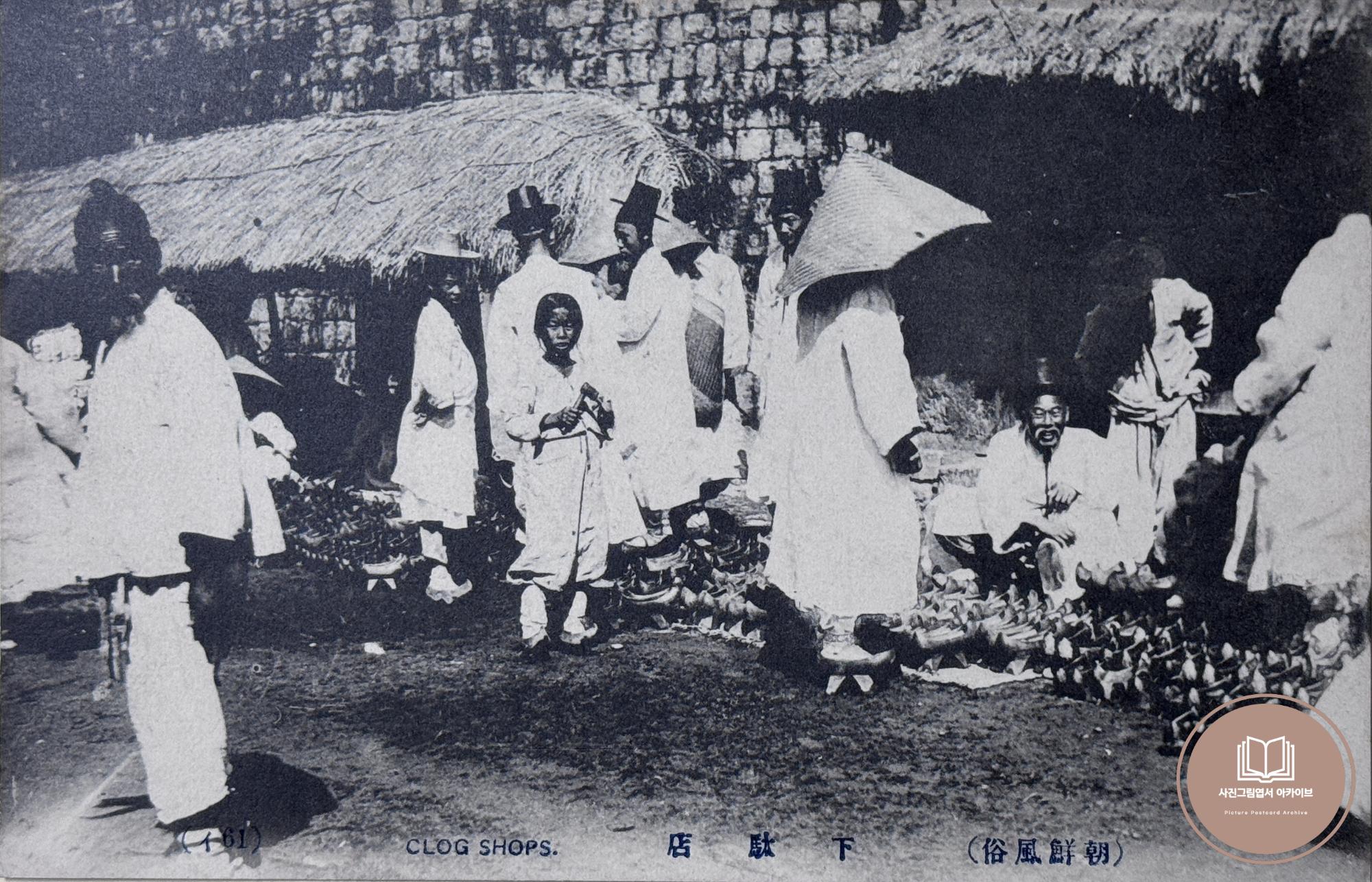 1910년대 일출상행(日之出商行)에서 발행한 조선풍속 시리즈 사진그림엽서 중 성벽 옆에 위치한 나막신 상점 모습이 담긴 자료이다. 삿갓을 쓴 사람이 나막신을 신고 있는 모습이 담겨있고, 그 앞에 쭈그려 앉은 상인이 웃음을 짓고 있는 표정이 익살스럽게 담겨있다.
