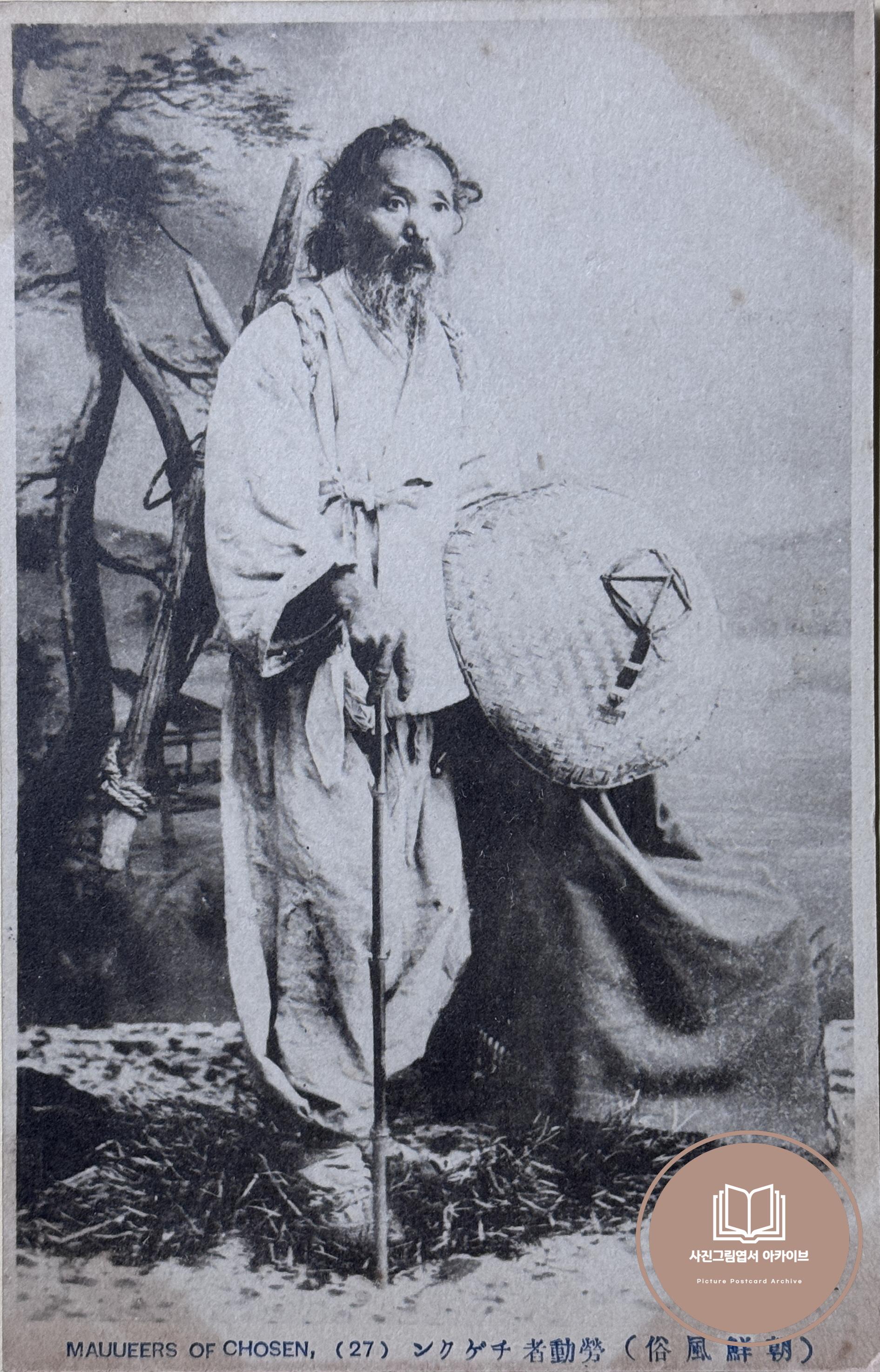 1910년대 일출상행(日之出商行)에서 발행한 것으로 추정되는 조선풍속 시리즈 사진그림엽서 중 지게 노동자 모습이 수록된 자료이다. 노쇠한 지게꾼이 사진관 내 배경을 두고 촬영한 의도된 피사체로 보여진다. 일반적인 지게 노동자 모습과 달리 늙고 허름한 모습을 일부러 촬영한 후 사진그림엽서로 발행한 것을 추정할 수 있다.