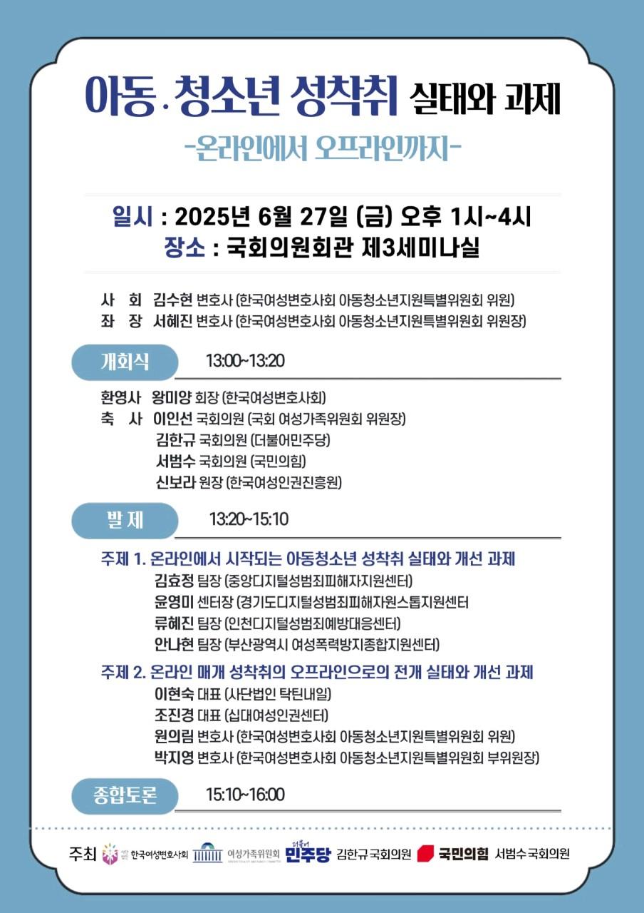 2025년 6월 27일 (금) 국회의원회관에서 진행된 [아동·청소년 성착취 실태와 과제 - 온라인에서 오프라인까지] 토론회 웹전단이다.