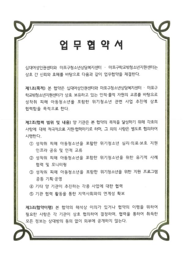 십대여성인권센터x마포구청소년상담복지센터·마포구학교밖청소년지원센터 MOU 업무협약서,업무협약서,MOU