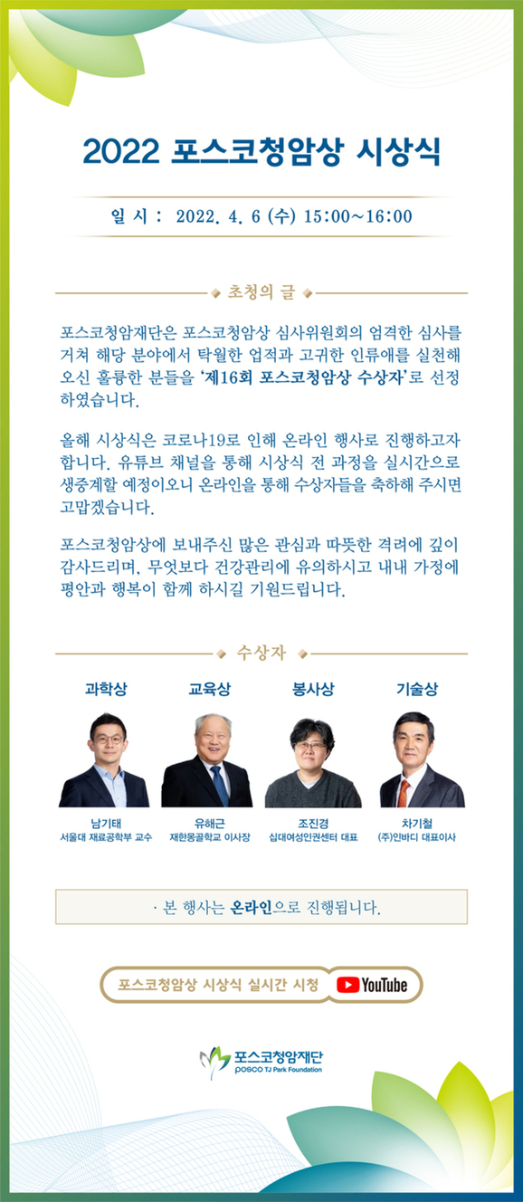 이미지는 포스코청암상 시상식 초청장이다.