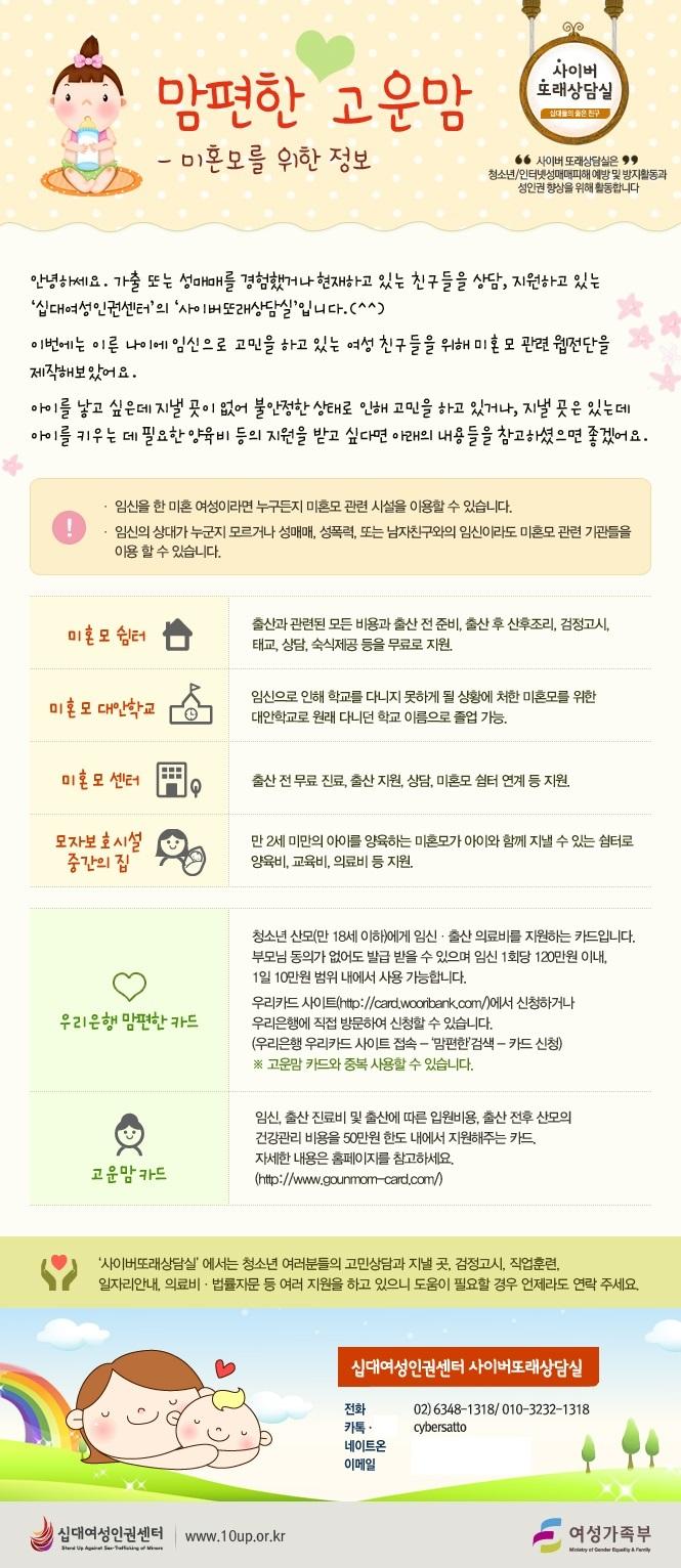 웹전단에는 법률지원단, 심리지원단, 피임법, 비공개상담, 고운맘 사업, 지원 사례 등의 내용이 있다.