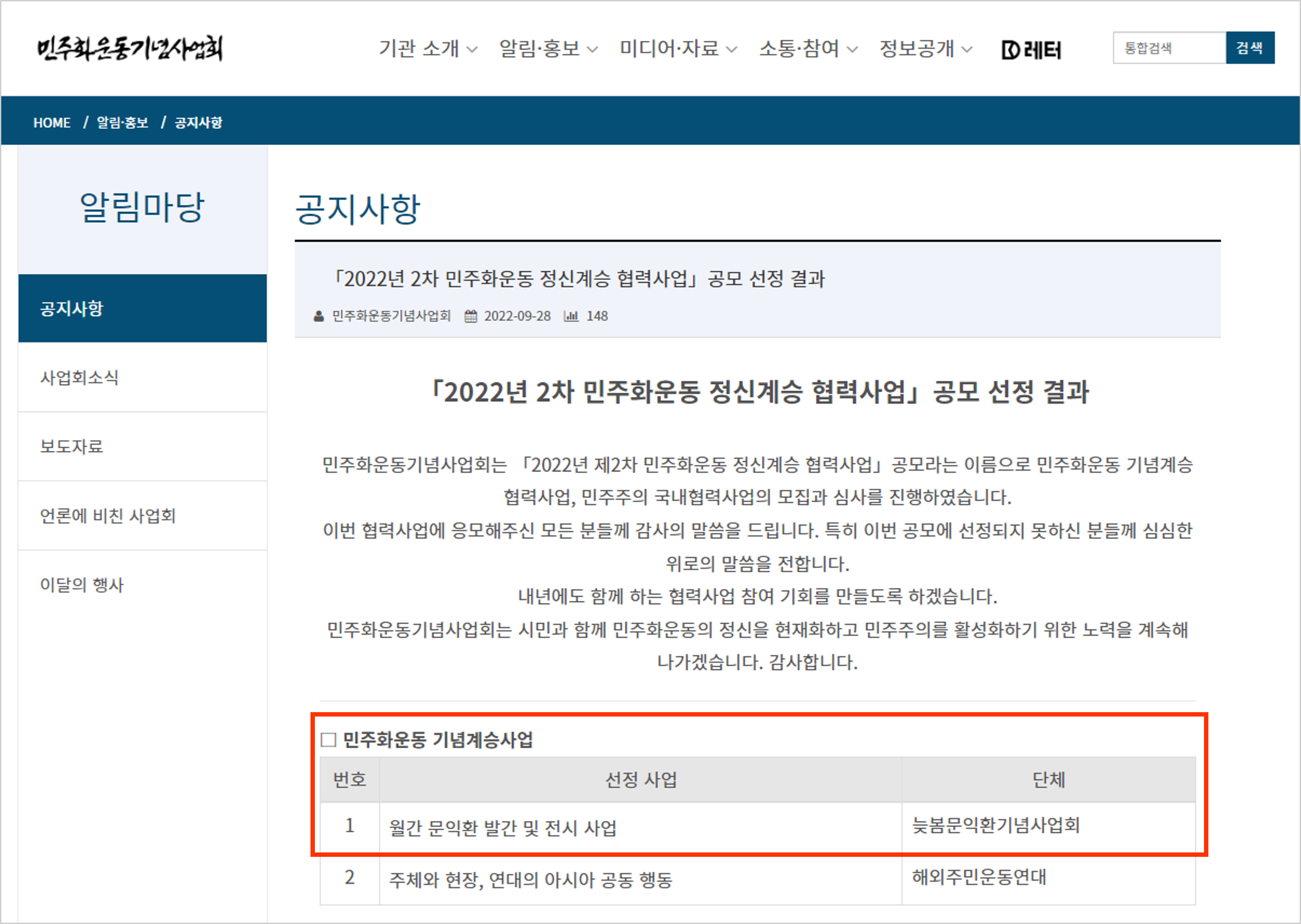 1. 「2022년 2차 민주화운동 정신계승 협력사업」공모 선정