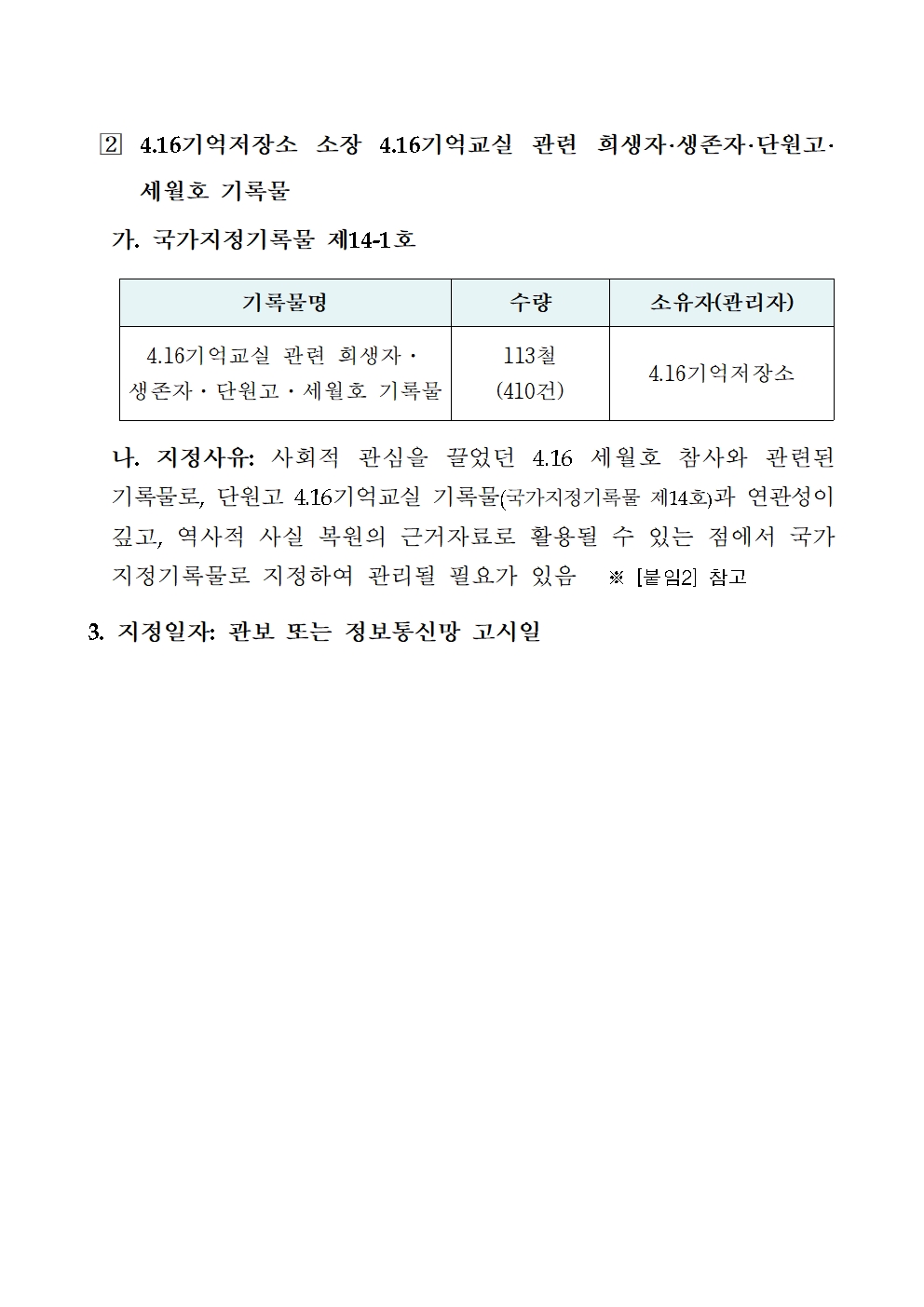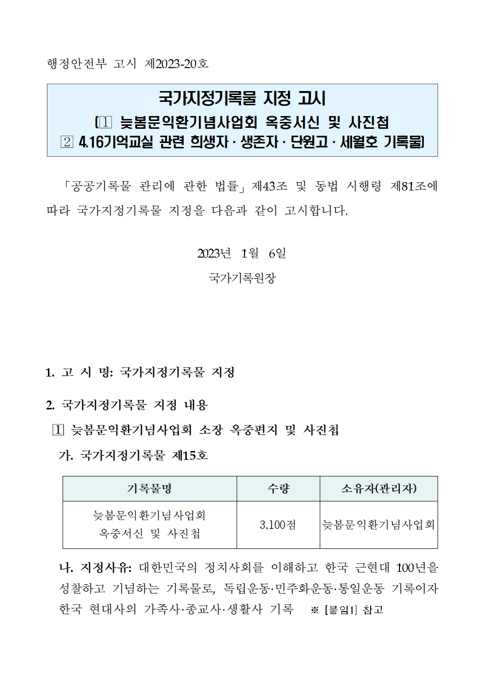 「︎공공기록물 관리에 관한 법률」︎ 제43조 및 동법 시행령 제81조에 따라 국가지정기록물 지정을 다음과