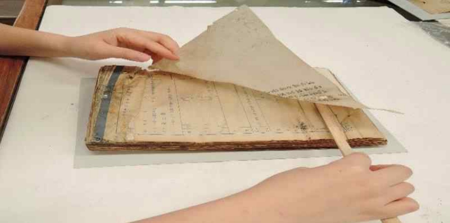 ◇나무로 된 구두주걱으로 수침 기록물 낱장을 분리하는 모습(국가기록원 재난피해기록물 응급조치 매뉴얼, 2022)