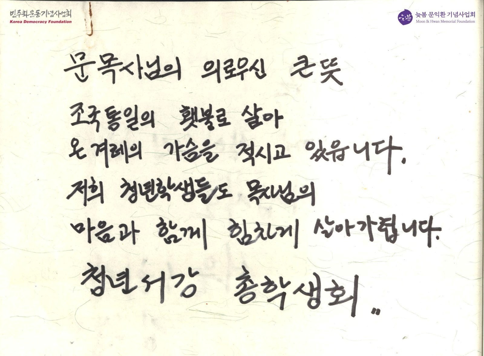 “문 목사님의 의로우신 큰 뜻 조국통일의 횃불로 살아 온 겨레의 가슴을 적시고 있읍니다. 저희 청년학생들도 목사님의 마음과 함께 힘차게 살아가렵니다.”